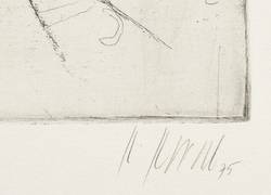 Aus: Karl Korab, 10 Radierungen zu Texten von Adalbert Stifter (Wien: Edition Tusch 1975). – Rechts unten in Bleistift signiert und datiert. Links Auflagenbezeichnung. – Blatt aus der Radierfolge ″10 Radierungen zu Texten von Adalbert Stifter″ mit illustrierenden Versuchen bzw. Adaptionen zur unvollendeten Material- und Romansammlung ″Die Mappe meines Urgrossvaters″ von Adalbert Stifter (1841). – Tadellos. Sehr guter Erhaltungszustand.