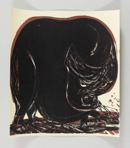 1964. Farbholzschnitt, in Braun & Schwarz, auf gelblichem Werkdruckpapier. – Originale Künstlergrafik, von HAP Grieshaber. – 33,2 x 30,8 cm (Darstellung / Druckbild), 35 x 31 cm (Blatt).