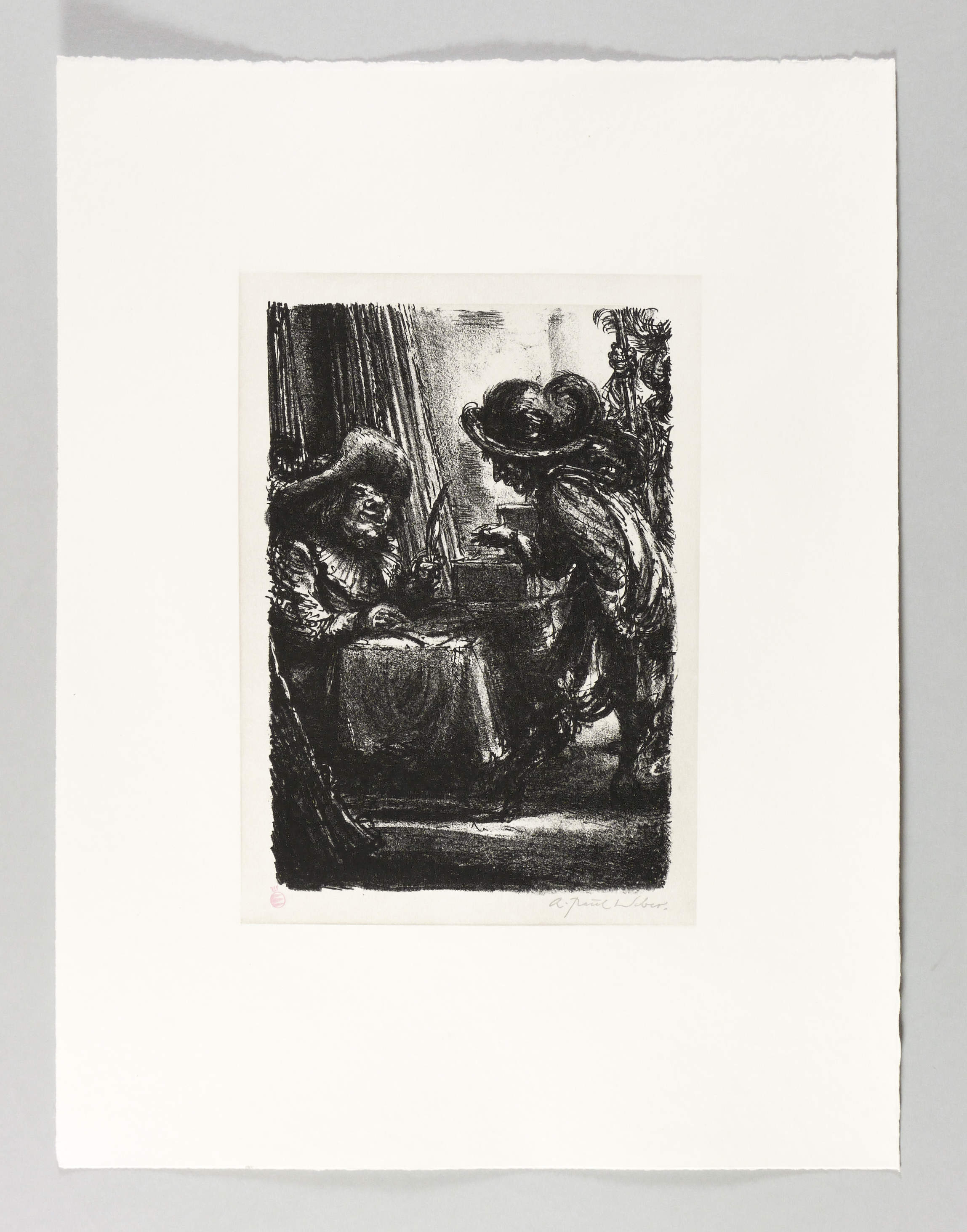 Nicht bei Arp. – Links unten in der Tonplatte Stempel in Rot mit dem Signet der Clan- Presse (ehem. Widerstandskreis). Rechts Stempel-Signatur. Verso Nachlass-Stempel mit Signatur vom Sohn Christian Weber in Bleistift. – Um 1925 plante Weber eine Holzschnitt-Folge zum Schelmenroman ″Der abenteuerliche Simplicissimus″ von Grimmelshausen. 1967- 69 setzte er die bis dahin entstandenen Vorarbeiten dann als Folge von 45 Lithografien um (Gütersloh: Bertelsmann 1971). Einblattdrucke aus der Entstehungszeit sind selten. Hier die gängige 1988 für die Edition Griffelkunst aus dem Nachlass herausgegebene Originallithografie (W 74). – Ohne jeden Tadel. Sehr guter Zustand.