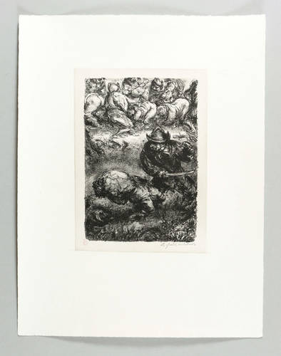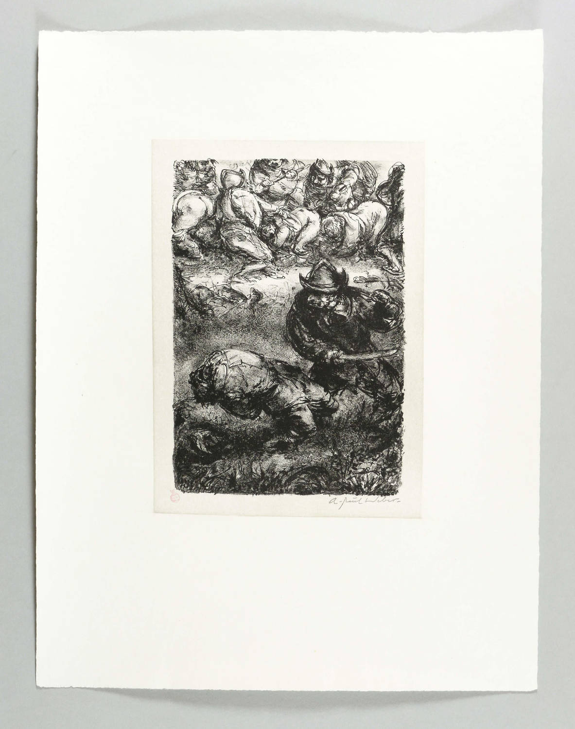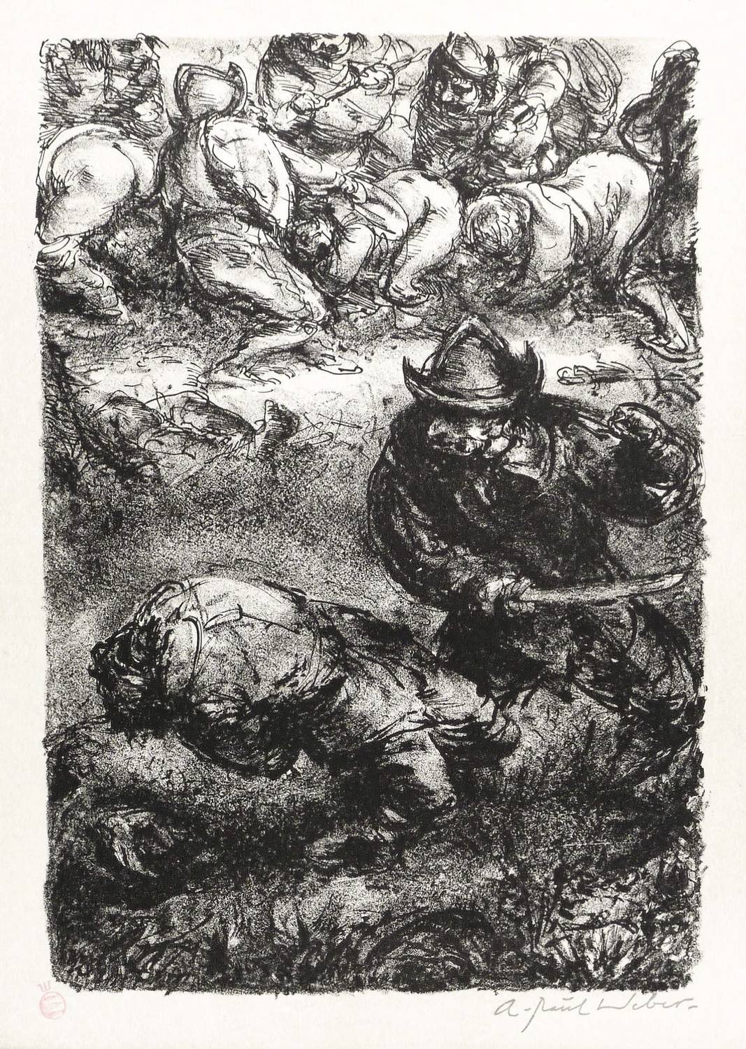 Nicht bei Arp. – Links unten in der Tonplatte Stempel in Rot mit dem Signet der Clan-Presse (ehem. Widerstandskreis). Rechts Stempel-Signatur. Verso Nachlass-Stempel mit Signatur vom Sohn Christian Weber in Bleistift. – Um 1925 plante Weber eine Holzschnitt-Folge zum Schelmenroman ″Der abenteuerliche Simplicissimus″ von Grimmelshausen. 1967- 69 setzte er die bis dahin entstandenen Vorarbeiten dann als Folge von 45 Lithografien um (Gütersloh: Bertelsmann 1971). Einblattdrucke aus der Entstehungszeit sind selten. Hier die gängige 1988 für die Edition Griffelkunst aus dem Nachlass herausgegebene Originallithografie (W 77). – Tadellos. Sehr guter Zustand.