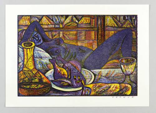 Esteban Fekete (1924 Cinkota / Budapest - 2009 Dieburg). Deutsch-argentinischer Maler, Zeichner und Grafiker. Arbeitete in verschiedenen Techniken wie Öl und Tempera, aber auch in Mischtechniken auf Papier, Holz oder Hartfaser. Anfang der 1970er Jahre entstanden Email-Bilder, Zeichnungen und Linolschnitt. Seine ureigene Technik ist allerdings der Holzschnitt, insbesondere der Farbholzschnitt, mit dem er sich einen Namen machte. So entwickelte er eine eigene Schnitt- und Bearbeitungstechnik für die Holzplatten. Für die Farbgebung verwendete er eigens dafür gesuchte Ölfarben.