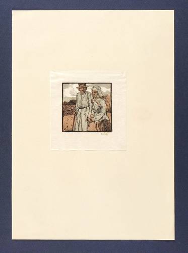 1898. Farbholzschnitt, in 3 Farben, auf feinem Japan. – Originale Künstlergrafik, von Emil Orlik. – 6,2 x 6,3 cm (Darstellung / Druckstock), 10,1 x 9,6 cm (Blatt), 29 x 20 cm (Trägerblatt).