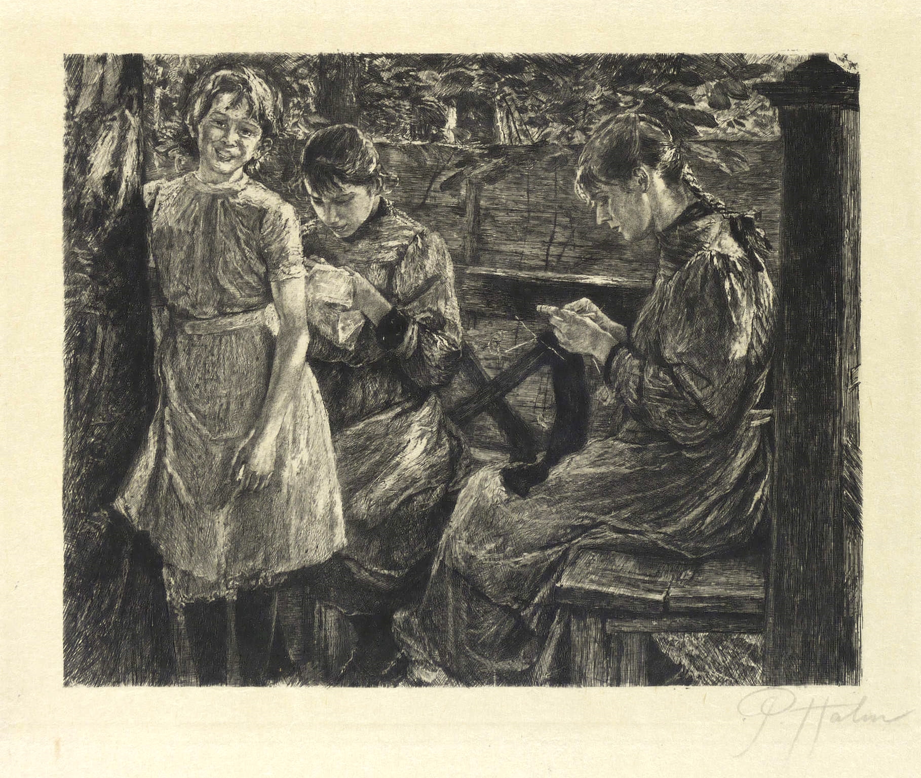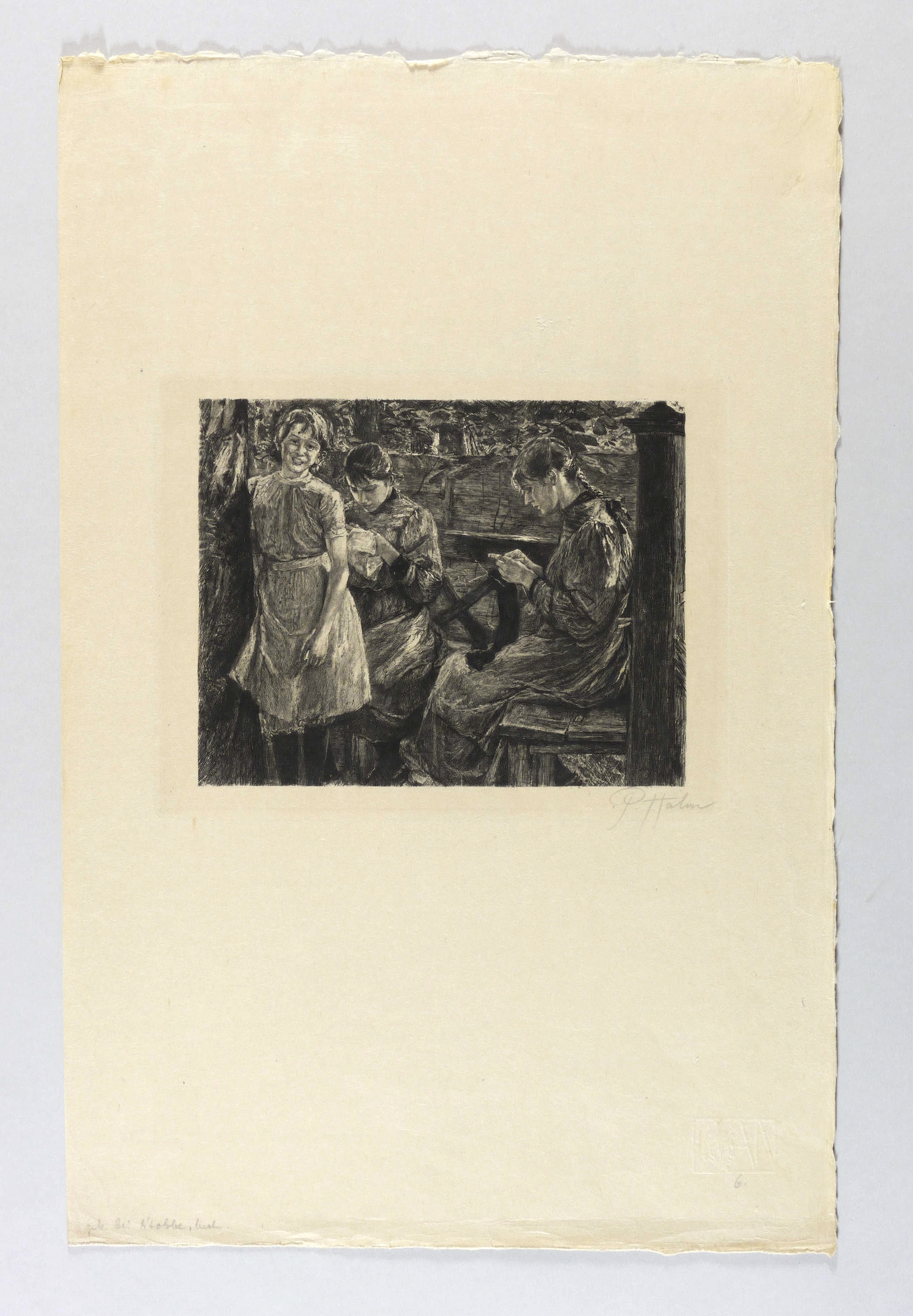 Aus: Pan (Berlin: Fontane 1896), Bd. 2. – Rechts unten in Bleistift signiert: ″P. Halm″. Dazu Trockenstempel des Pan. – Originalradierung nach dem 1896 entstandenen Gemälde ″Meine Töchter″ von Fritz von Uhde. - Aus der signierten und nummerierten Auflage für die Vorzugsausgabe des PAN. – Sehr guter Zustand.