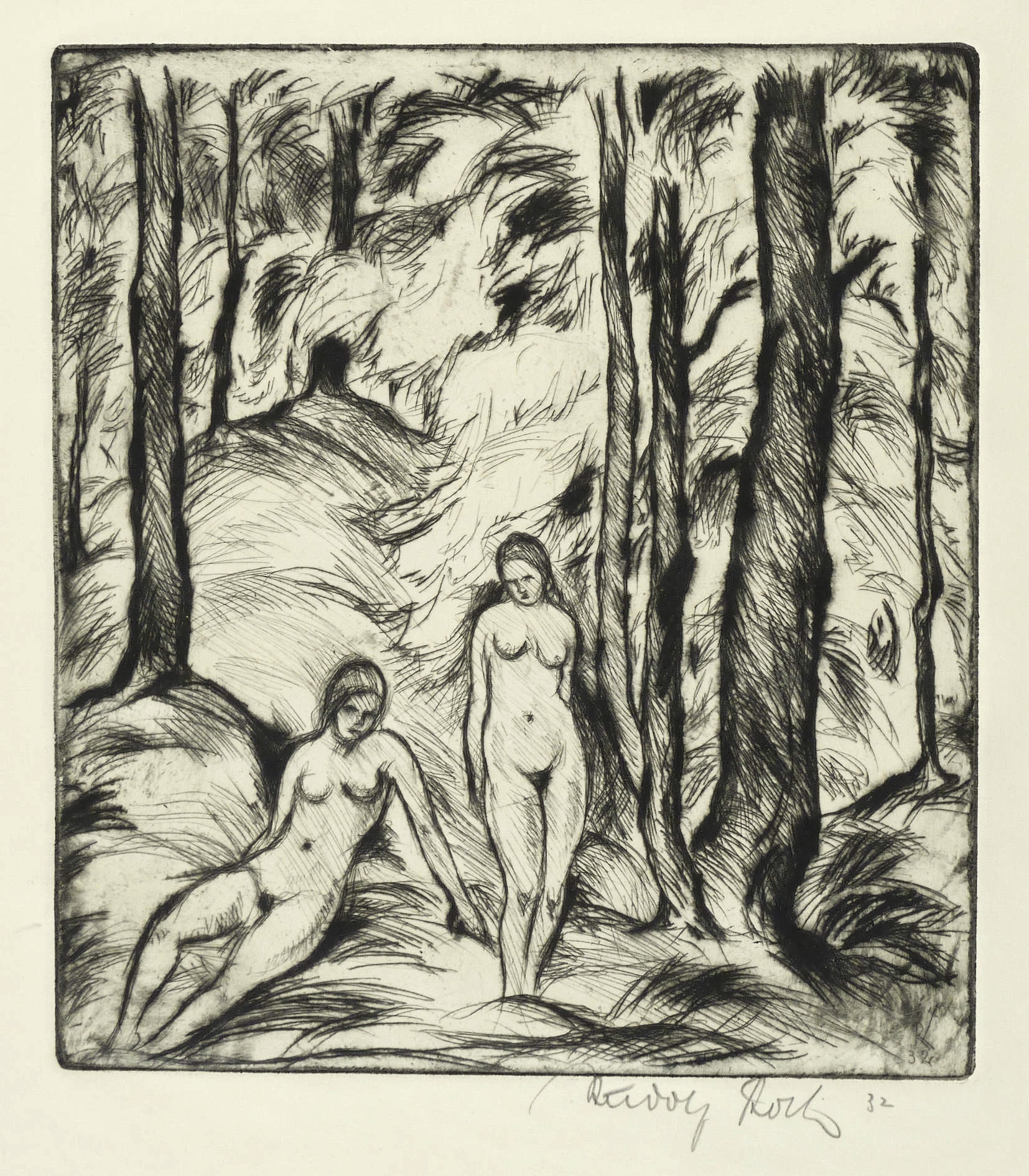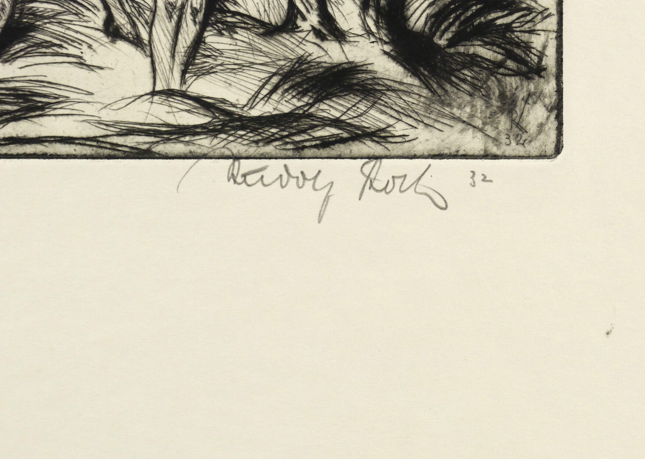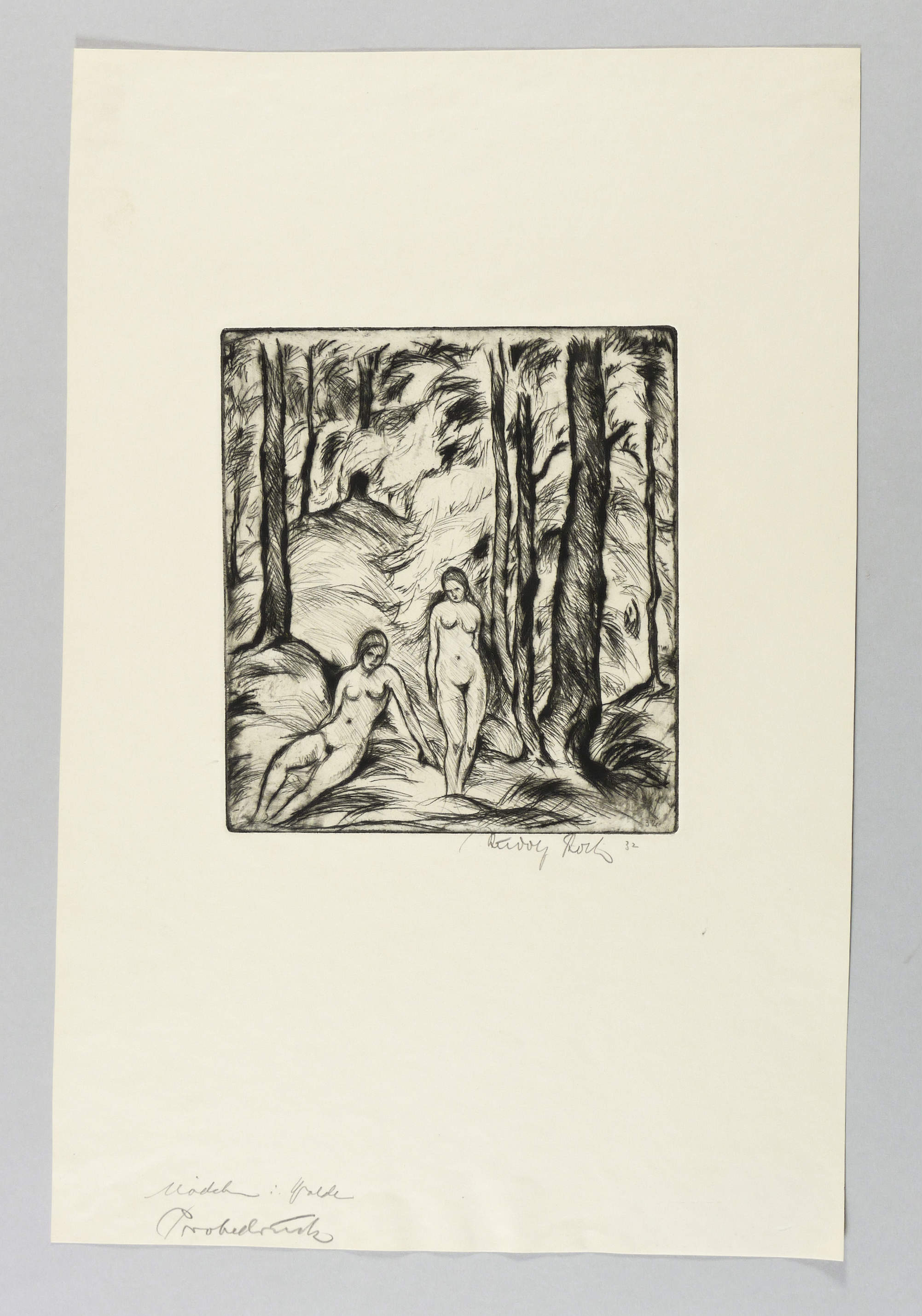 Rechts unten in Bleistift signiert und datiert: ″Rudolf Koch 32″. In der Platte direkt darüber nochmals Monogramm und Jahr: ″RK 32″. Am unteren Blattrand links in Bleistift Titel und Auflagenbezeichnung: ″Mädchen im Walde / Probedruck″. – Ohne Mängel. Sehr guter Zustand.