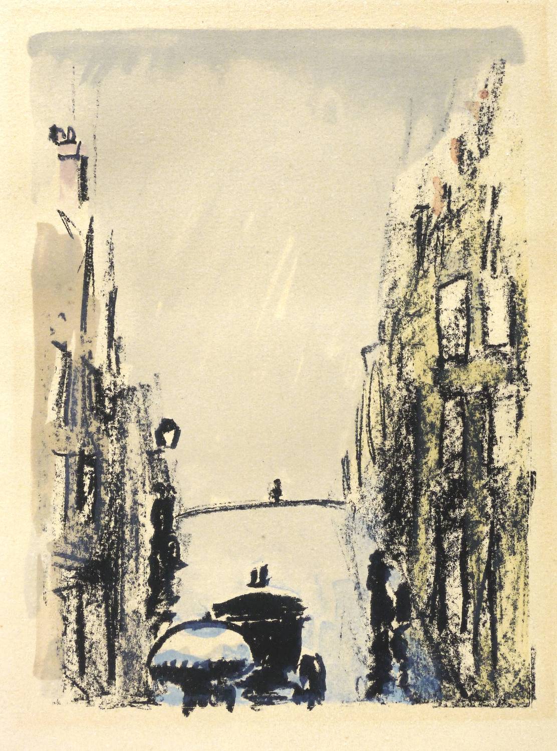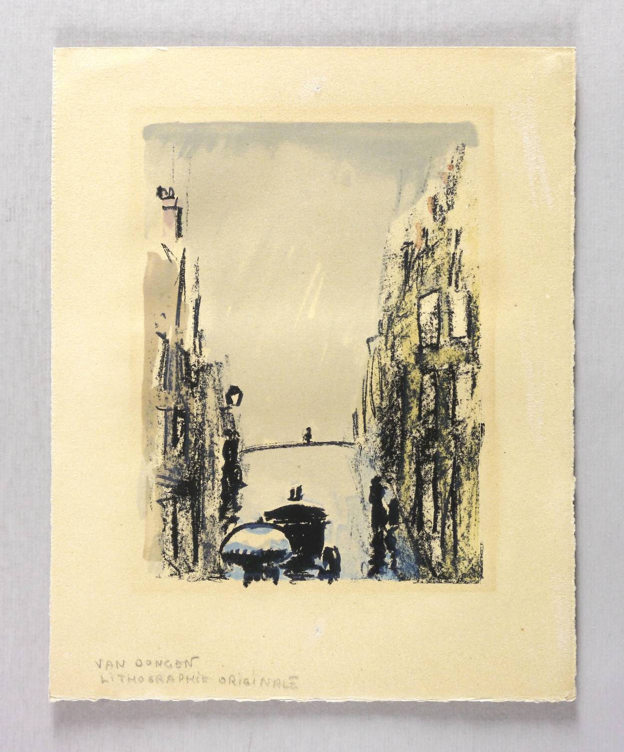 Juffermans B 13. – Aus: Roland Dorgelès, Au beau temps de la Butte (Paris: Nouvelle Librairie de France 1949). – Nicht signiert. Verso typografisch bezeichnet: ″Une frontière de la Butte: la rue des Trois Frères″. Im unteren Blattrand in Bleistift bezeichnet: ″VAN DONGEN / LITHOGRAPHIE ORIGINALE″. – Blatt 5 der 20 ganzseitigen originalgrafischen Illustrationen von Kees van Dongen zu den Erinnerungen ″Au beau temps de la Butte″ von Roland Dorgelès (Paris: Nouvelle Librairie de France 1949). - Limitierte Auflage von 25 auf Arches gedruckten Exemplaren. - Sowohl der Text als auch die Bilder speisen sich aus Erinnerungen an das Bateau-Lavoir, den Freundeskreis um Pablo Picasso und das Leben auf dem Montmarte. – Papier durchgehend etwas gebräunt. Leichter Lichtrand um die Darstellung. Recht guter Zustand.