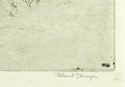 1914. Radierung / Strichätzung, in Schwarz, auf leichtem hellgelbem Ingres-Bütten. – Originale Künstlergrafik, von Ferdinand Steiniger. – 18,8 x 31,1 cm (Darstellung / Platte), 25 x 42 cm (Blatt).
