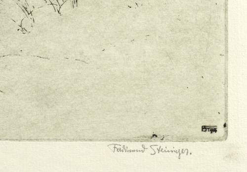 Ferdinand Steiniger (1882 Leipzig - 1959 Dresden-Loschwitz). Oft auch falsch Ferdinand Steininger. Deutscher Maler, Buchkünstler und Grafiker. Schüler von Richard Müller, Oskar Zwintscher und Eugen Bracht an der Dresdener Kunstgewerbeschule und später an der Kunstakademie Dresden. War in Dresden-Loschwitz ansässig. 1938 Sonderausstellung im Badischen Kunstverein von Karlsruhe. Studierte insbesondere die Landschaft seiner unmittelbaren Umgebung, wie z.B. die Dresdner Heide, die in zahlreichen Radierungen thematisiert wurde.