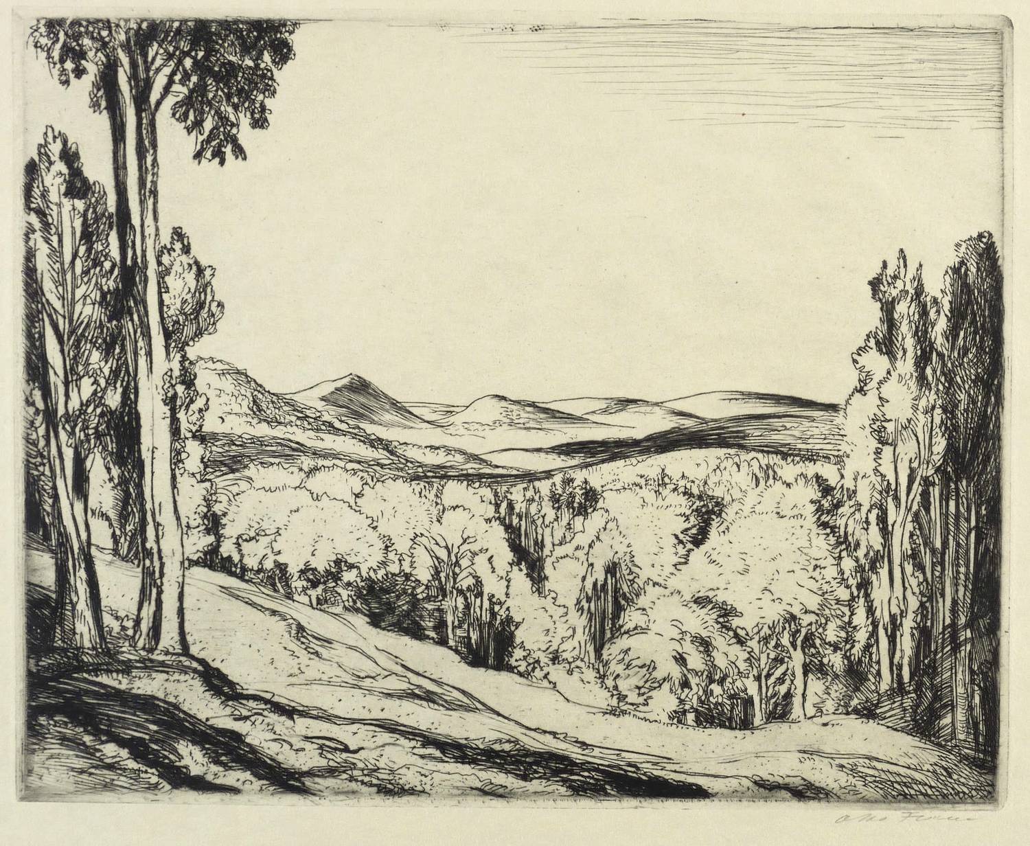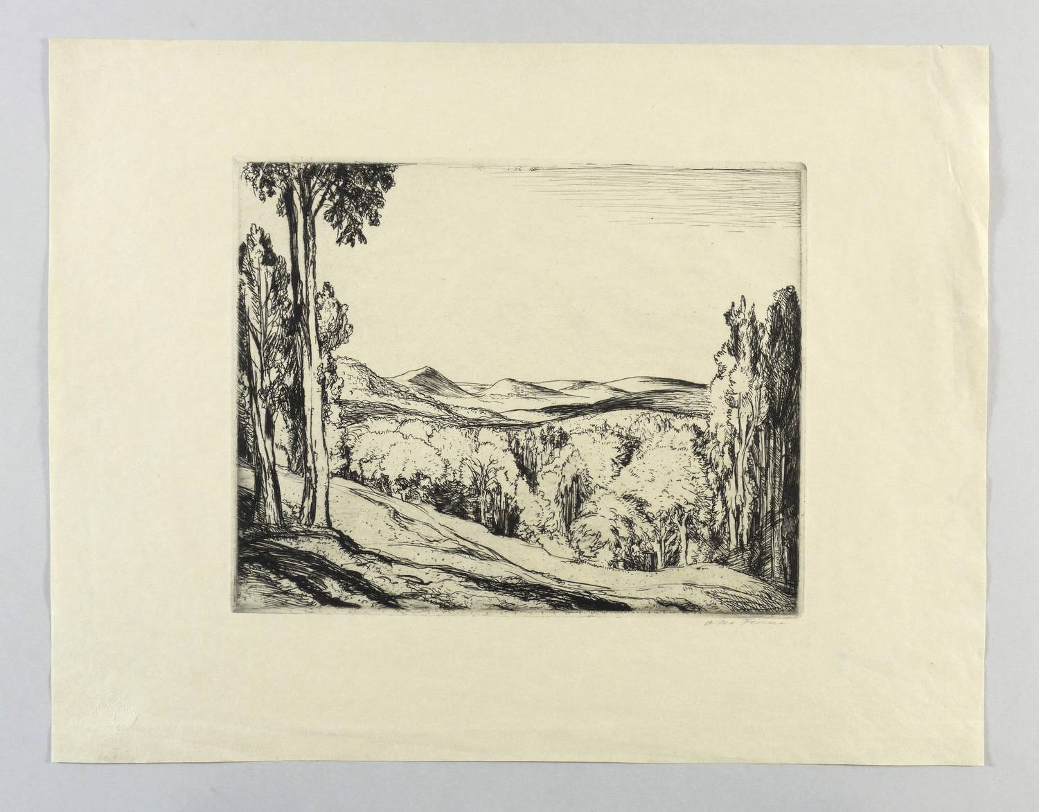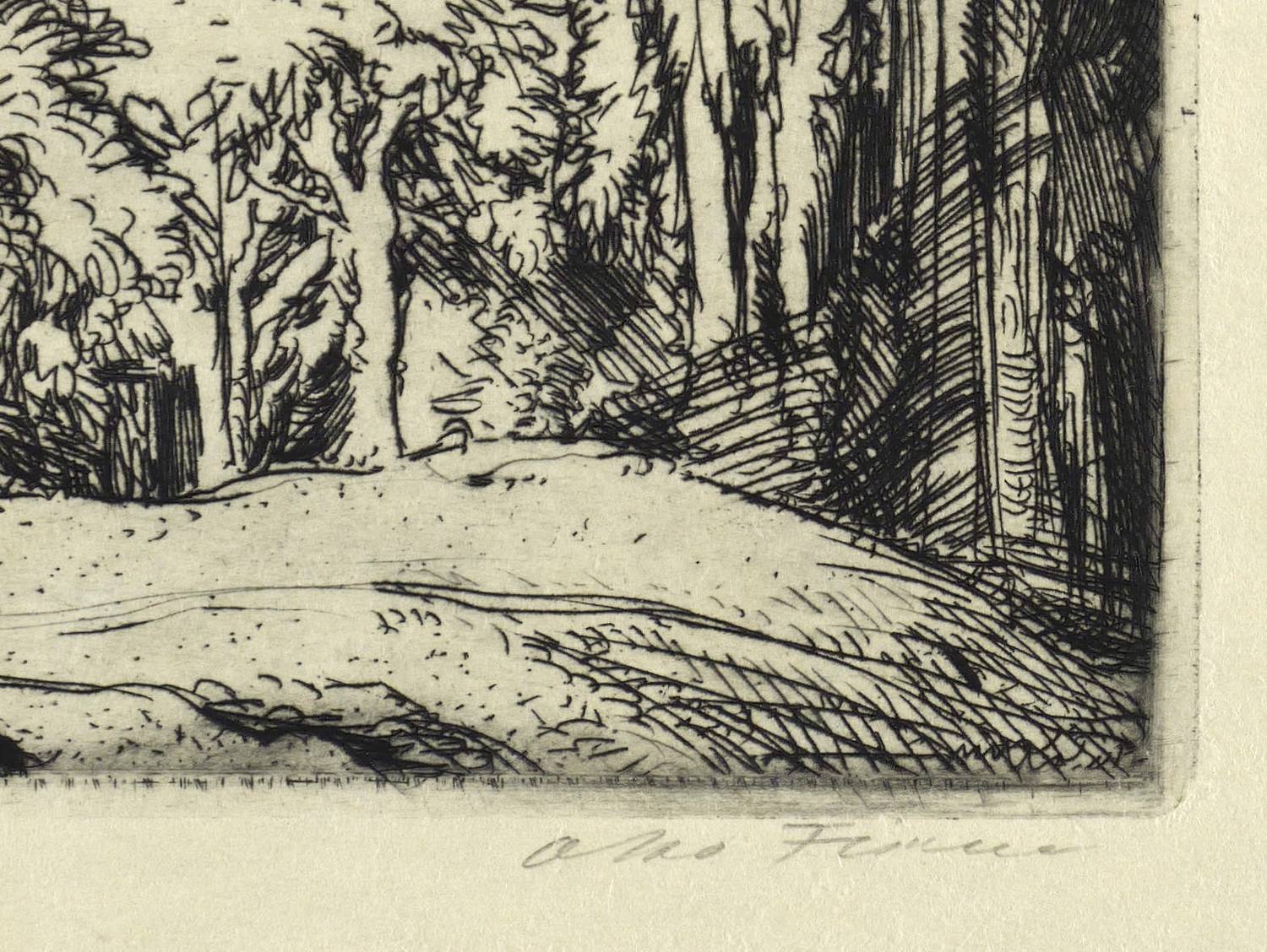 1900-1910. Radierung / Strichätzung, in Schwarz, auf leichtem gelbem Velin. – Originale Künstlergrafik, von Otto Fischer. – 23,6 x 29,8 cm (Darstellung / Platte), 38 x 49 cm (Blatt).