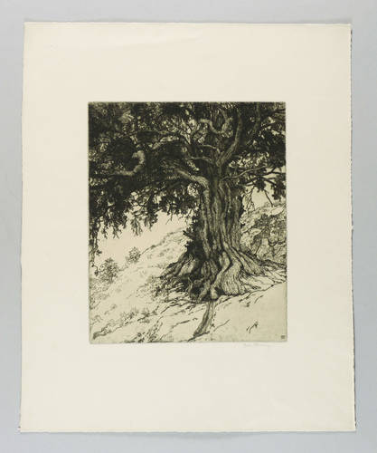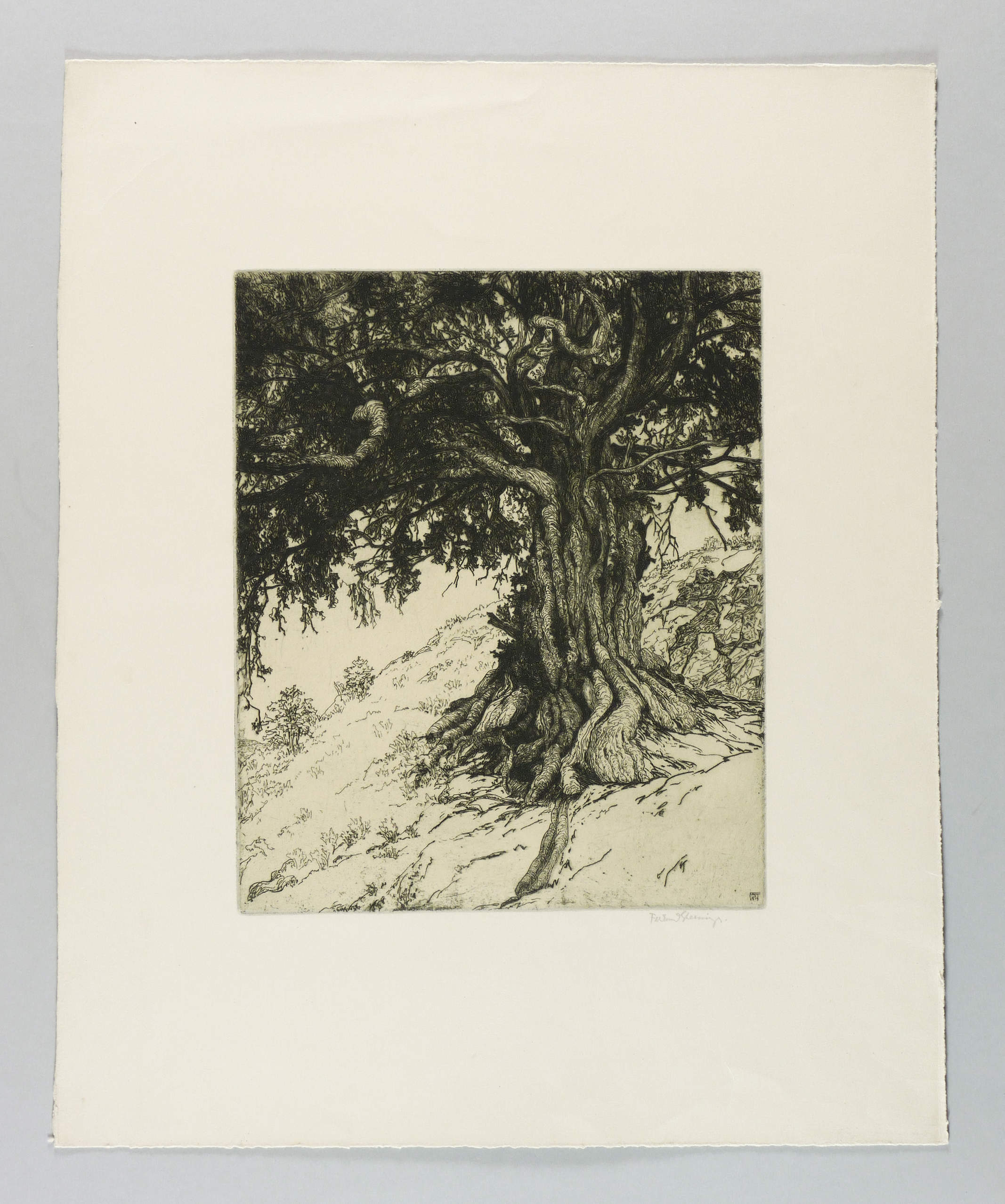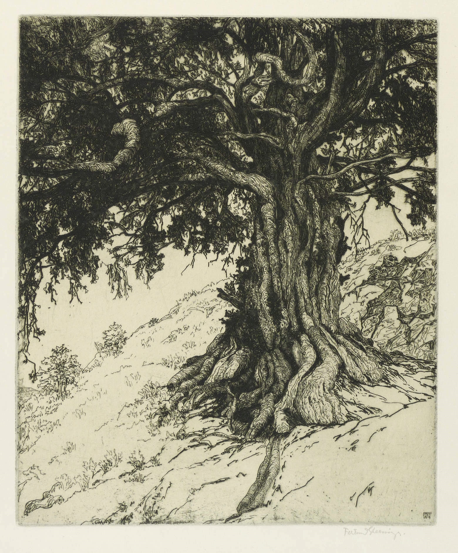 1919. Radierung / Strichätzung, mit Plattenton, in Schwarzgrün, auf gelbem Velinkarton. – Originale Künstlergrafik, von Ferdinand Steiniger. – 33,9 x 28,1 cm (Darstellung / Platte), 58 x 47 cm (Blatt).