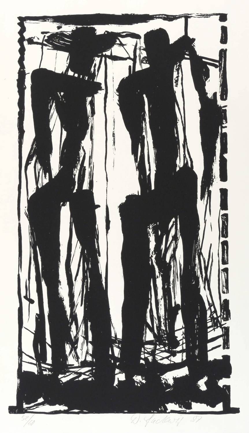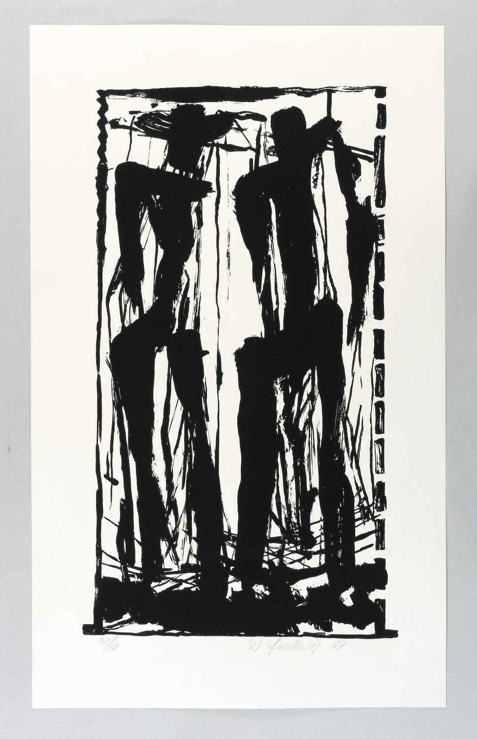 1987. Siebdruck / Serigrafie, in Schwarz, auf glattem weißem Karton. – Von Dieter Ladewig. – Auflage Exemplar Nr. 52/60. – 47,6 x 25,2 cm (Darstellung / Druckbild), 59 x 36 cm (Blatt).