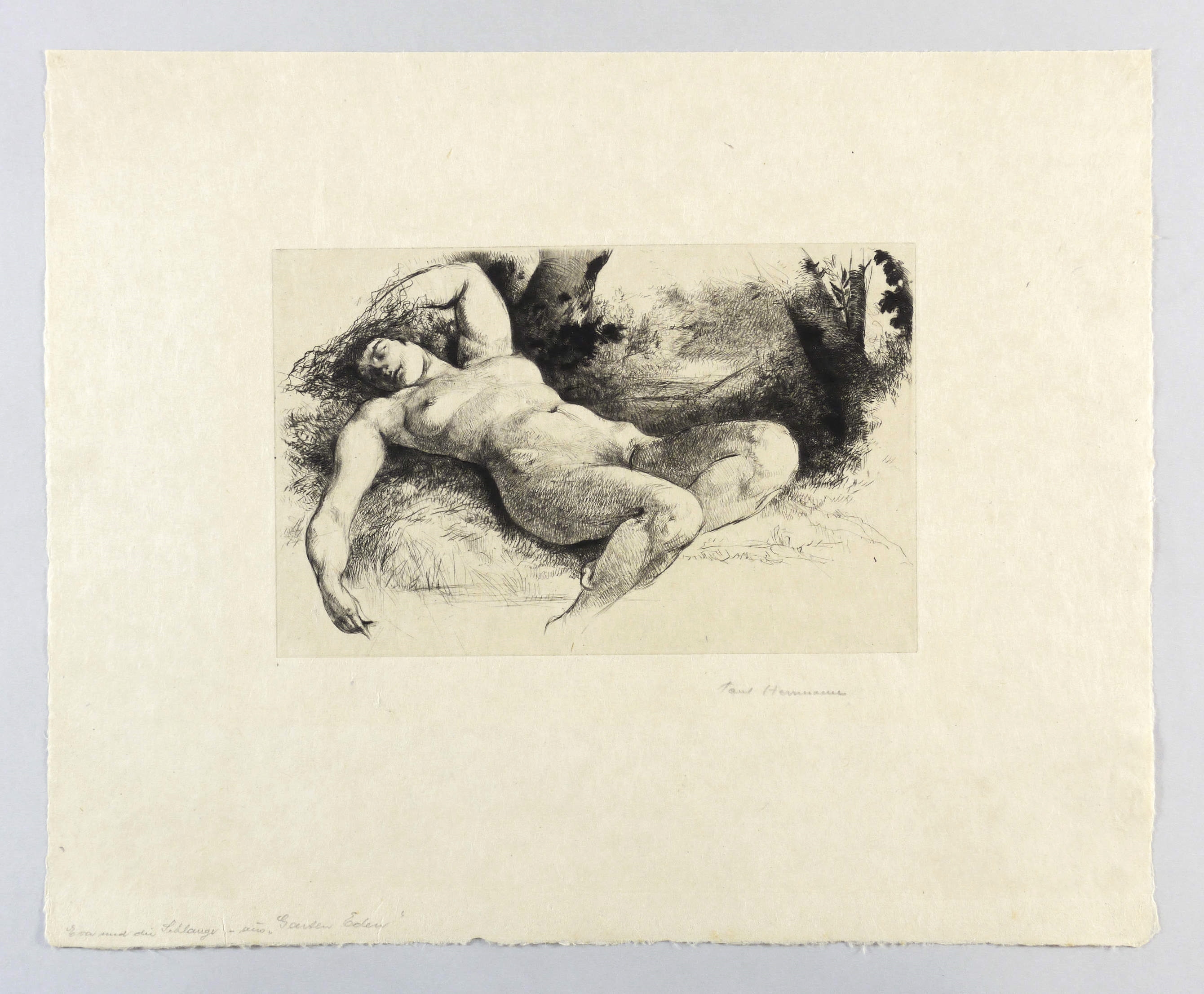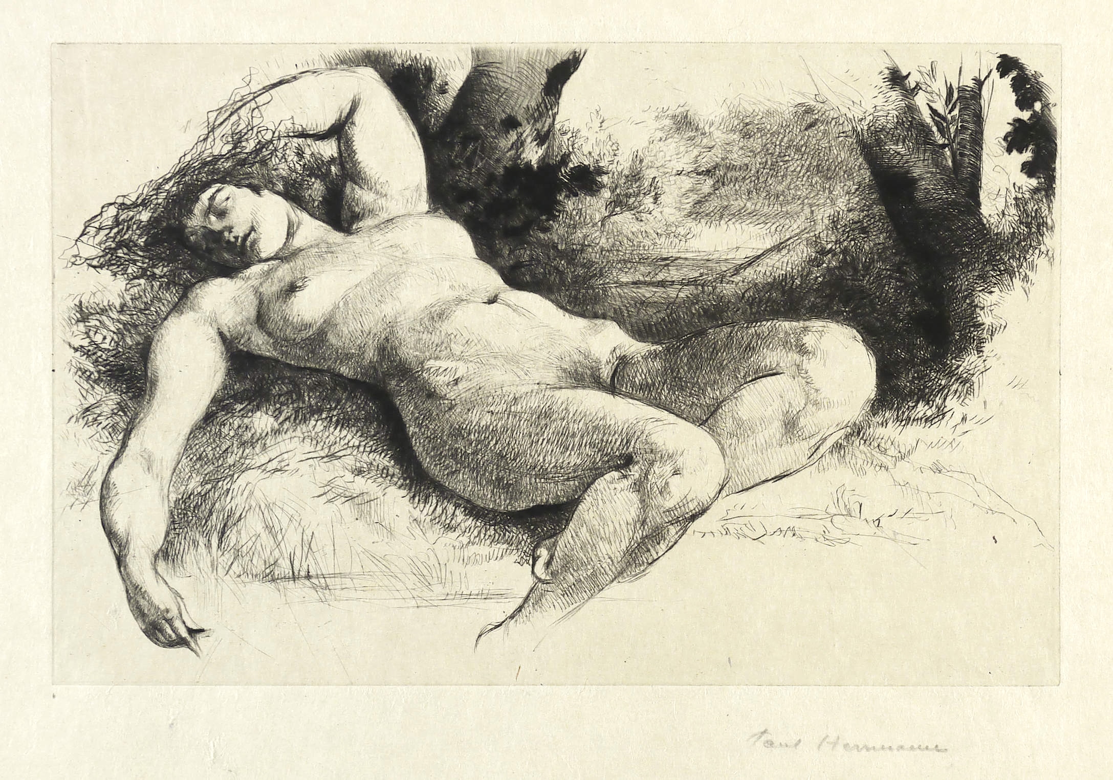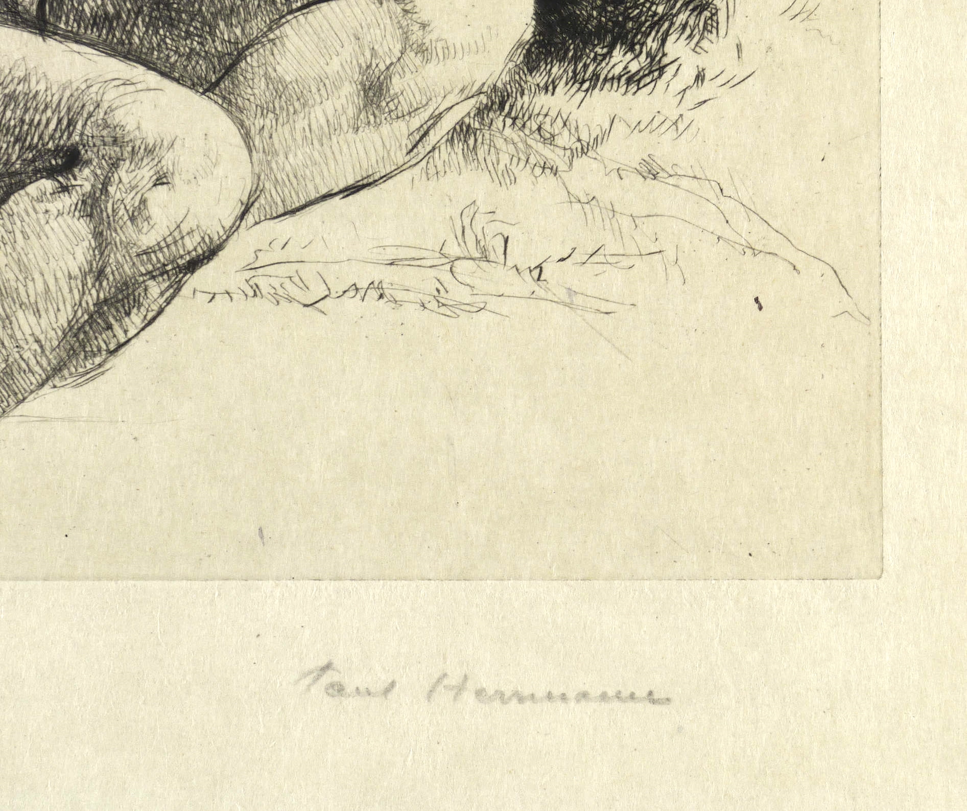 Aus: Paul Herrmann (Henri Héran), Sechs Kaltnadelarbeiten zur Legende vom Garten Eden ([Berlin]: Eigenverlag 1919). – Rechts unten in Bleistift signiert: ″Paul Herrmann″. Am Blattrand links unten von fremder Hand bezeichnet. – Schönes erotisches Blatt. – Ohne Tadel. Sehr guter Zustand.