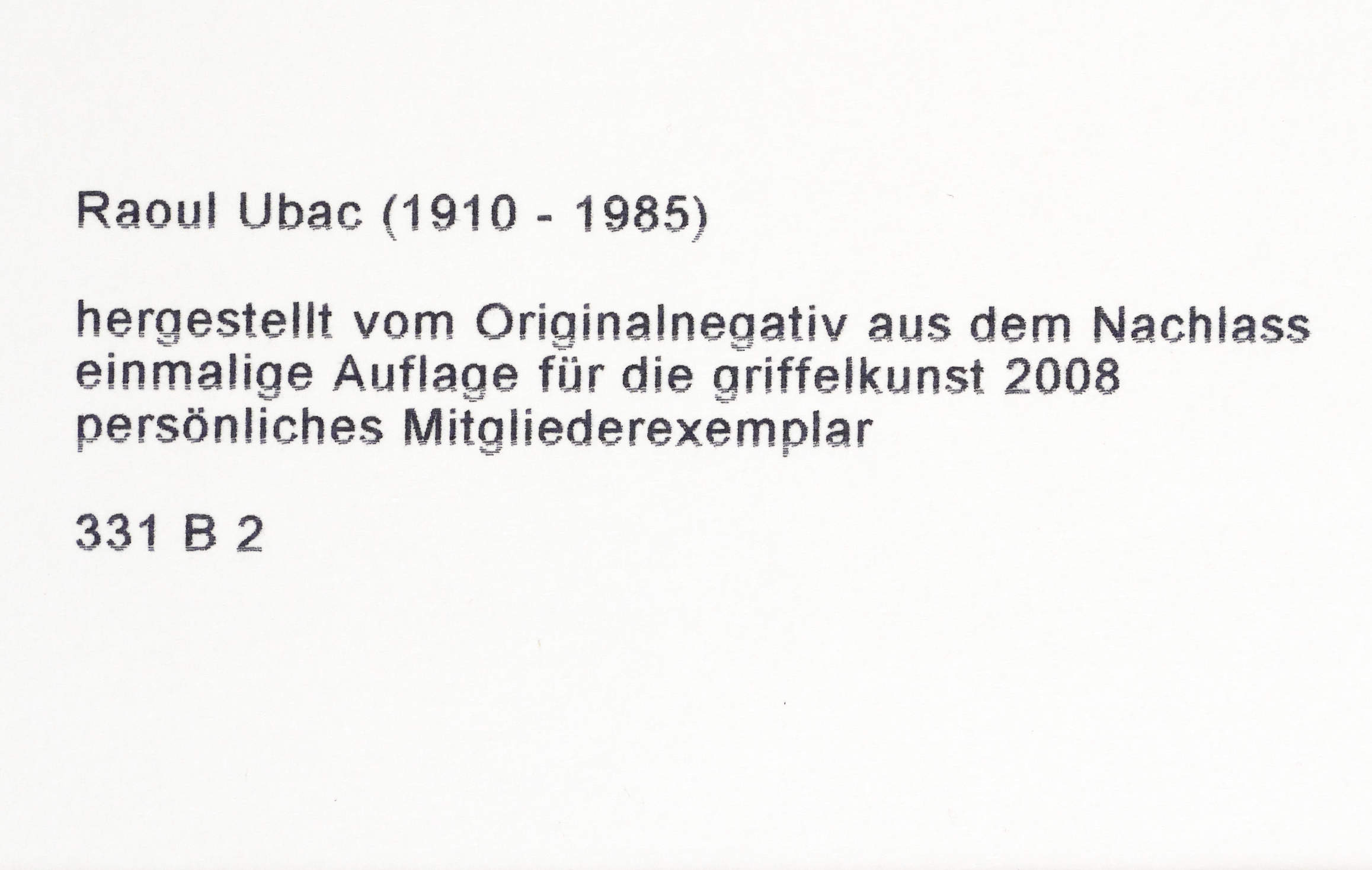 Griffelkunst 331 B2. – Aus: Raoul Ubac, Ein tachistischer Photograph. Avant la lettre (Hamburg: Griffelkunst-Vereinigung 2008). – Verso typografisch bezeichnet und nummeriert. – Fotografische Aufnahme von Raoul Ubac. - Einmalige Edition der Griffelkunst (Wahl 331). Abzug vom originalen Negativ aus dem Künstler-Nachlass. – Tadellos erhalten. Sehr guter Zustand.