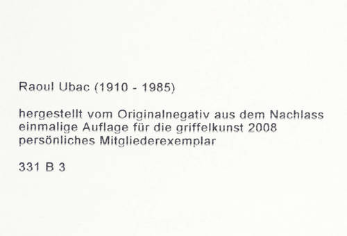 Raoul Ubac (1910 Köln - 1985 Dieudonné). Belgischer Maler, Fotograf und Bildhauer. Vertreter des Surrealismus und des Tachismus. Kam 1919 mit der Familie von Köln und Frankfurt nach Malmedy bei Lüttich. 1928 erster Aufenthalt in Paris, Bekanntschaft mit Otto Freundlich. Anfang der 1930er Jahre zweiter Aufenthalt in Paris, Kontakt mit Vertretern des Surrealismus. 1933 erste Ausstellung surrealistischer Fotografien und Zeichnungen. 1934 Edition eines eigenen Gedichtbands mit Fotografien. Zusammenarbeit mit Dichtern wie Jean Lescure, Raymond Queneau, Paul Éluard oder Claude Esteban, deren Bücher er illustrierte. 1938 Teilnahme an der von André Breton und Paul Éluard organisierten "Exposition Internationale du Surréalisme" in der Galerie Beaux-Arts in Paris. Mitte der 1940er Abwendung von der Fotografie zugunsten der Malerei. Stilistisch entwickelte er sich weg vom Surrealismus zu einer klareren Abstraktion. 1959 Teilnahme an der documenta II in Kassel.