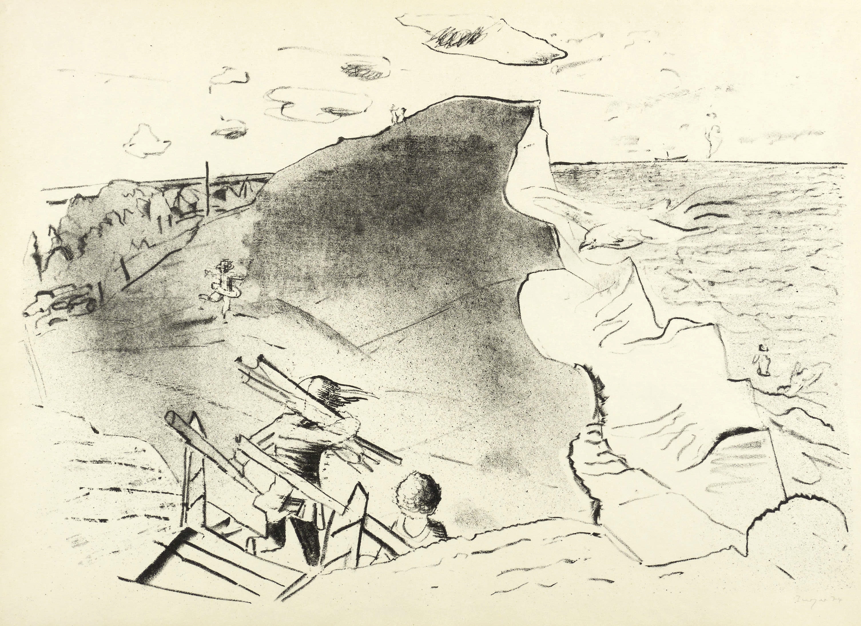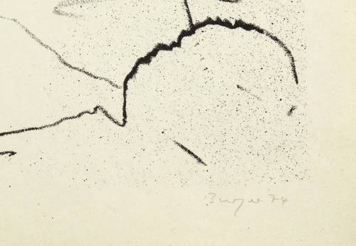 1974. Lithografie / Kreidelithografie, partiell gespritzt, in Schwarz, auf hellgelbem Velinkarton. – Von Dietrich Burger. – 32,0 x 44,3 cm (Darstellung), 34 x 48 cm (Blatt).
