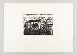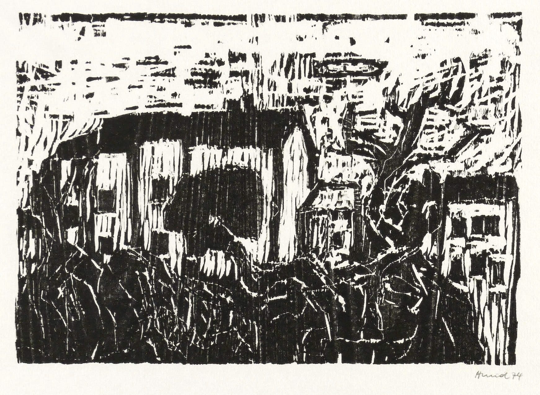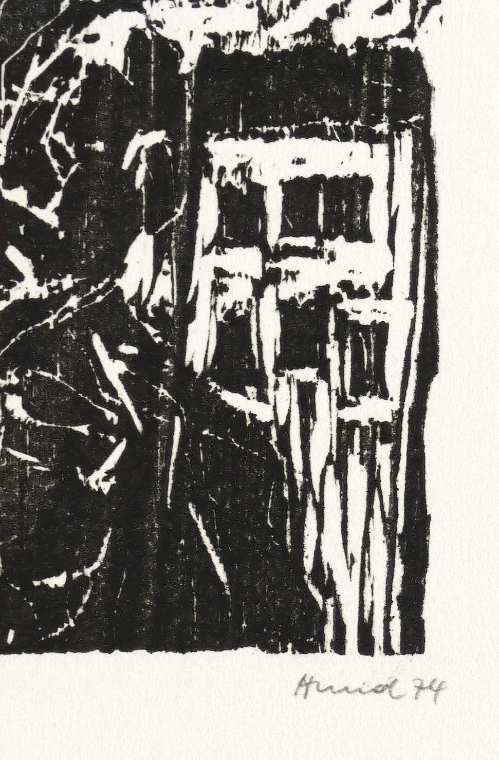 1974. Holzschnitt, in Schwarz, auf rauem weißem Japan-Imitat. – Originale Künstlergrafik, von Hans-Peter Hund. – 14,3 x 20,4 cm (Darstellung / Druckstock), 34 x 48 cm (Blatt).