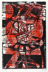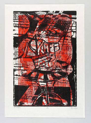 1990. Farbholzschnitt, in Rot & Schwarz, auf rauem Japanimitat. – Originale Künstlergrafik, von Günther Huniat. – Auflage Exemplar Nr. 71/100. – 40,6 x 26,8 cm (Darstellung / Druckstock), 48 x 34 cm (Blatt).