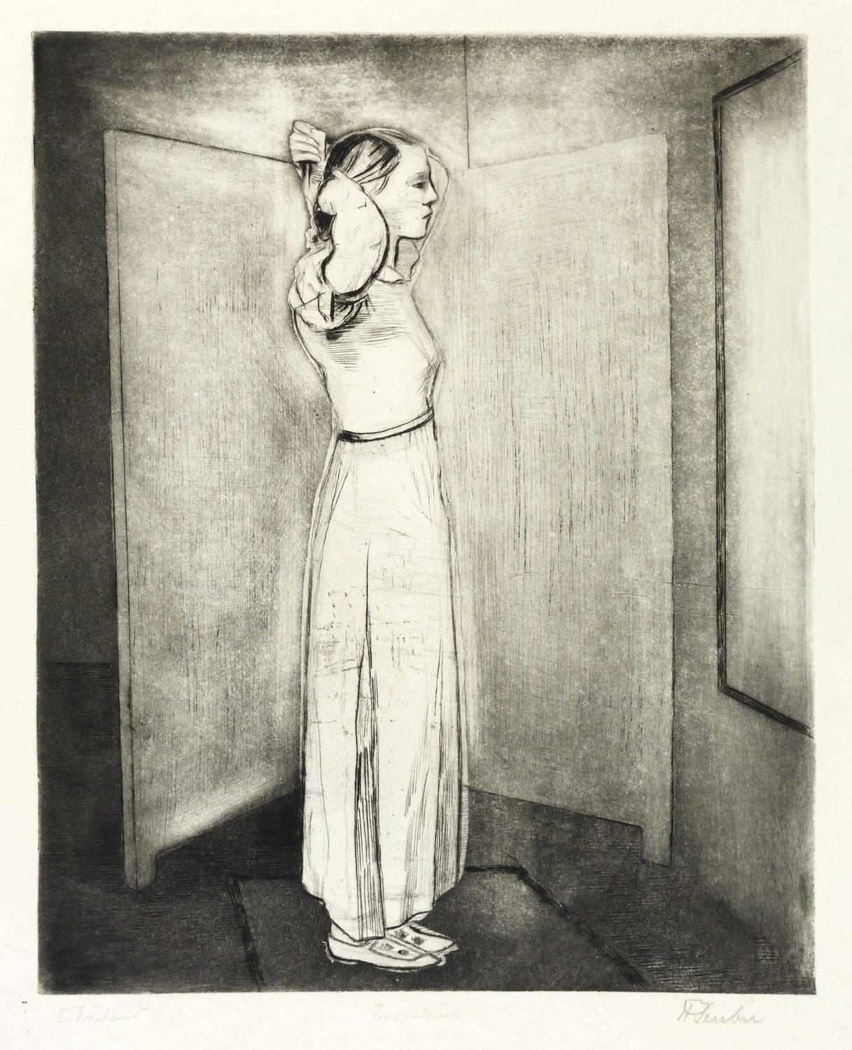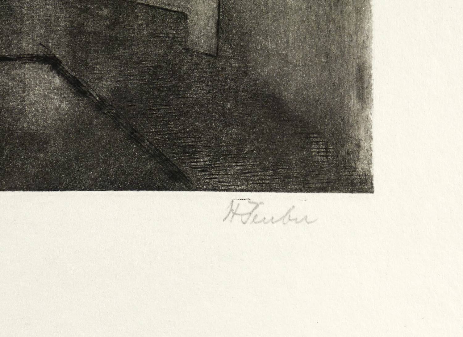 Rechts unten in Bleistift signiert: ″HTeuber″. Links und mittig bezeichnet: ″II. Zustand / Probedruck″. In der Blattecke links unten eigenhändig Titel. – Leicht bestoßene Blattecken. Originalrandiges Exemplar. Insgesamt sehr guter Zustand.