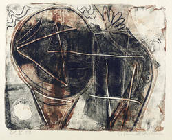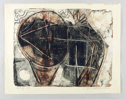 1956. Farbmonotypie, in Rotbraun & Schwarz, auf gelbem Hahnemühle. – Originale Künstlergrafik, von Helmut Schmidt-Kirstein. – Unikat. – 42,4 x 53,8 cm (Darstellung / Druckbild), 50 x 63 cm (Blatt).
