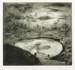 Aus: Sighard Gille, auge ufer hain. Sechs Radierungen, gewidmet Wassili Schukschin (Leipzig: Reclam 1987). – Rechts unten in Bleistift signiert und datiert: ″Gille 86″. Links Auflagenbezeichnung: ″18/110″. Mittig Titel: ″Auge″. – Sehr gut erhalten.