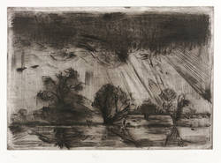Aus: Sighard Gille, auge ufer hain. Sechs Radierungen, gewidmet Wassili Schukschin (Leipzig: Reclam 1987). – Rechts unten in Bleistift signiert und datiert: ″Gille 86″. Links Auflagenbezeichnung: ″18/110″. Mittig Titel: ″Ufer″. – Sehr gut erhalten.
