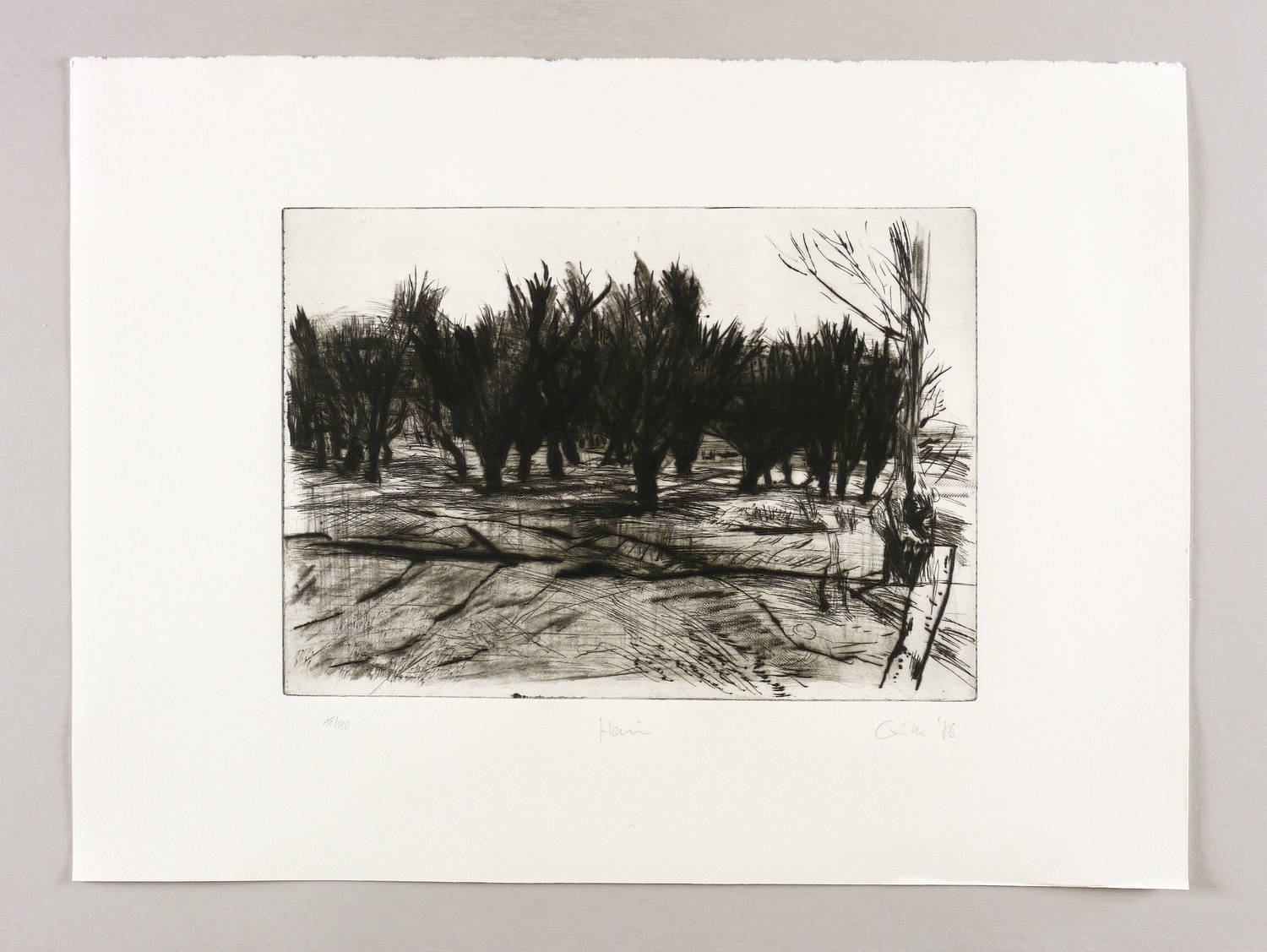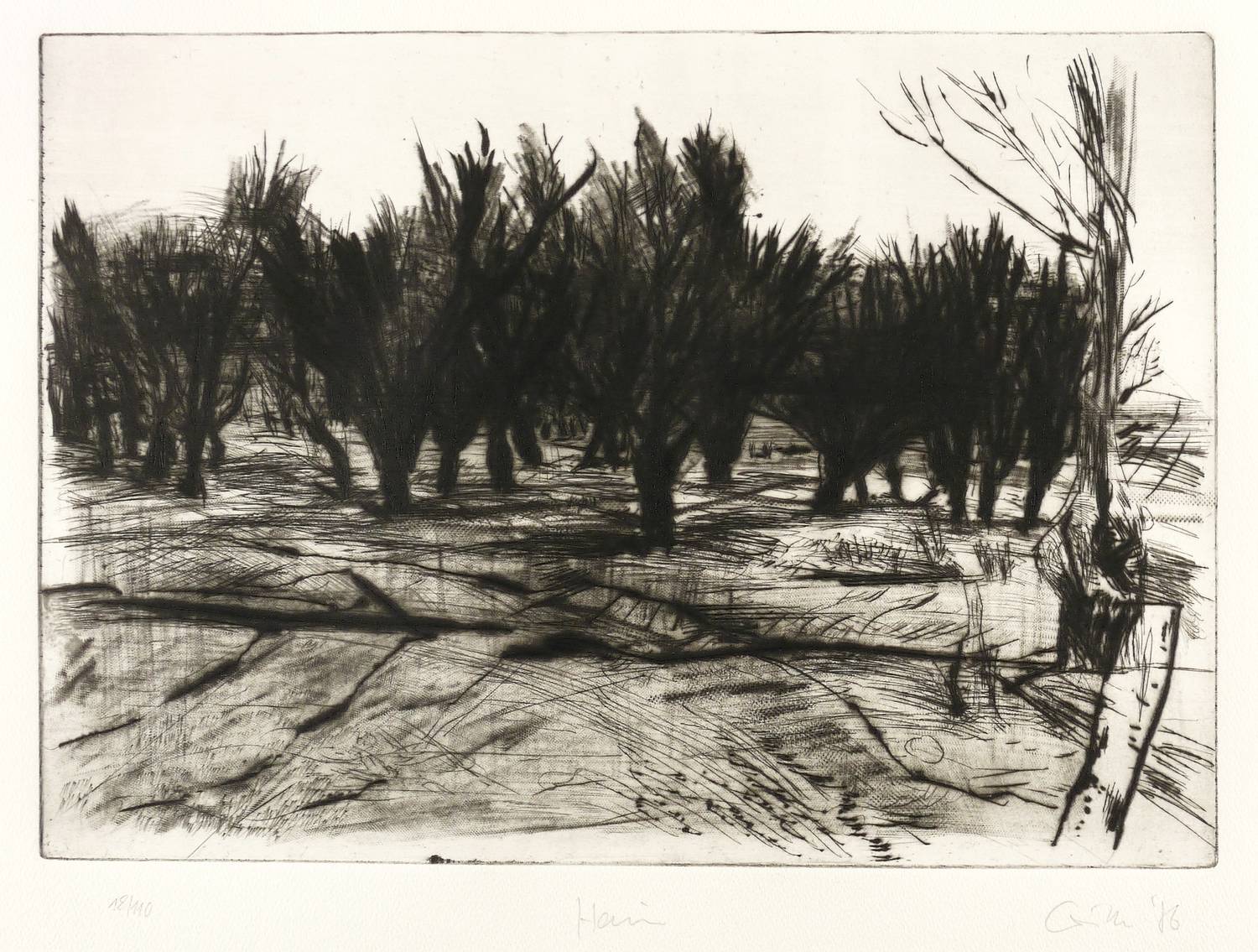 Aus: Sighard Gille, auge ufer hain. Sechs Radierungen, gewidmet Wassili Schukschin (Leipzig: Reclam 1987). – Rechts unten in Bleistift signiert und datiert: ″Gille 86″. Links Auflagenbezeichnung: ″18/110″. Mittig Titel: ″Hain″. – Sehr gut erhalten.