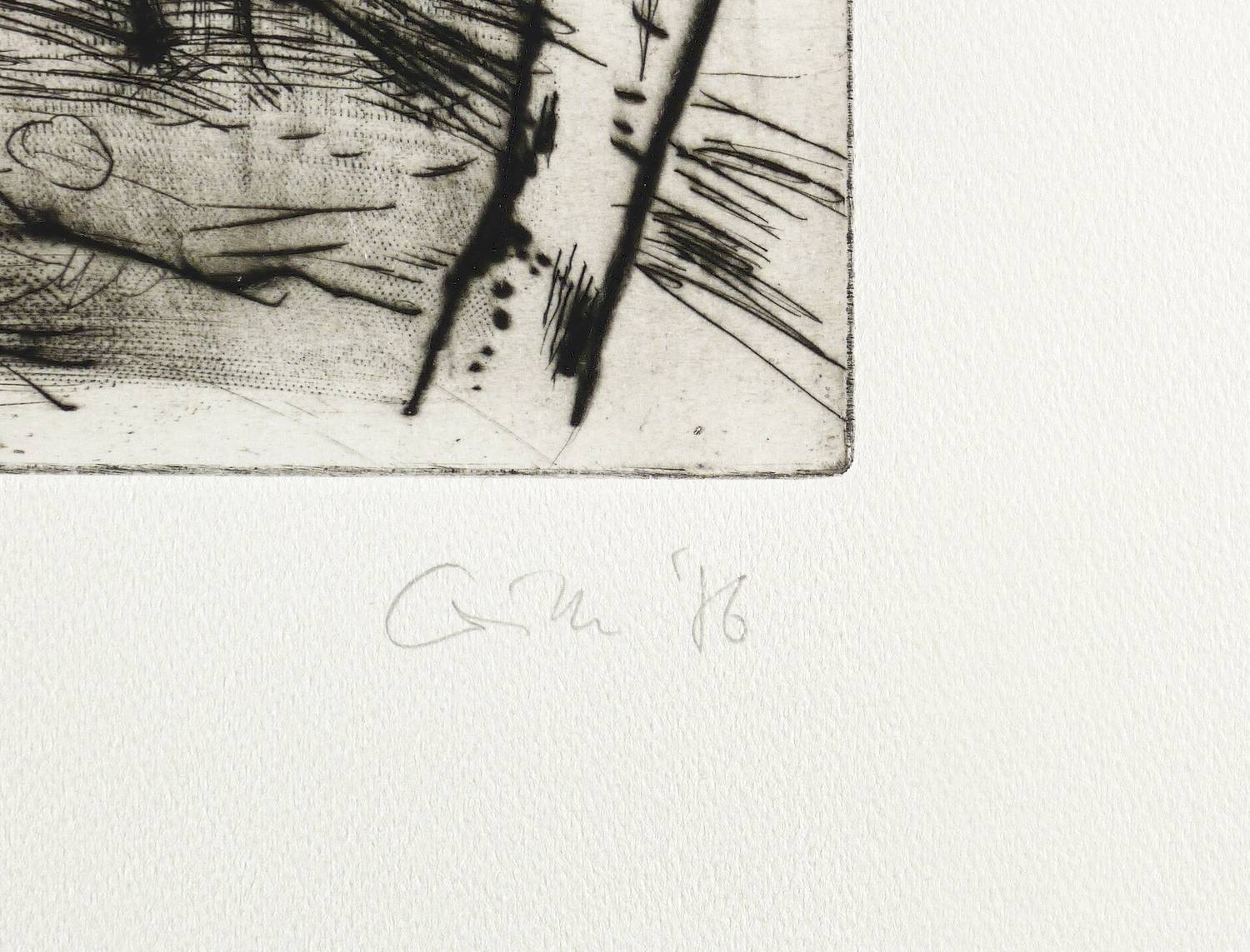 1986. Radierung / Roulette & Kaltnadel, in Schwarz, auf schwerem hellchamois Velin. – Originale Künstlergrafik, von Sighard Gille. – Auflage Exemplar Nr. 18/110. – 23,2 x 32,7 cm (Darstellung / Platte), 39 x 53 cm (Blatt).
