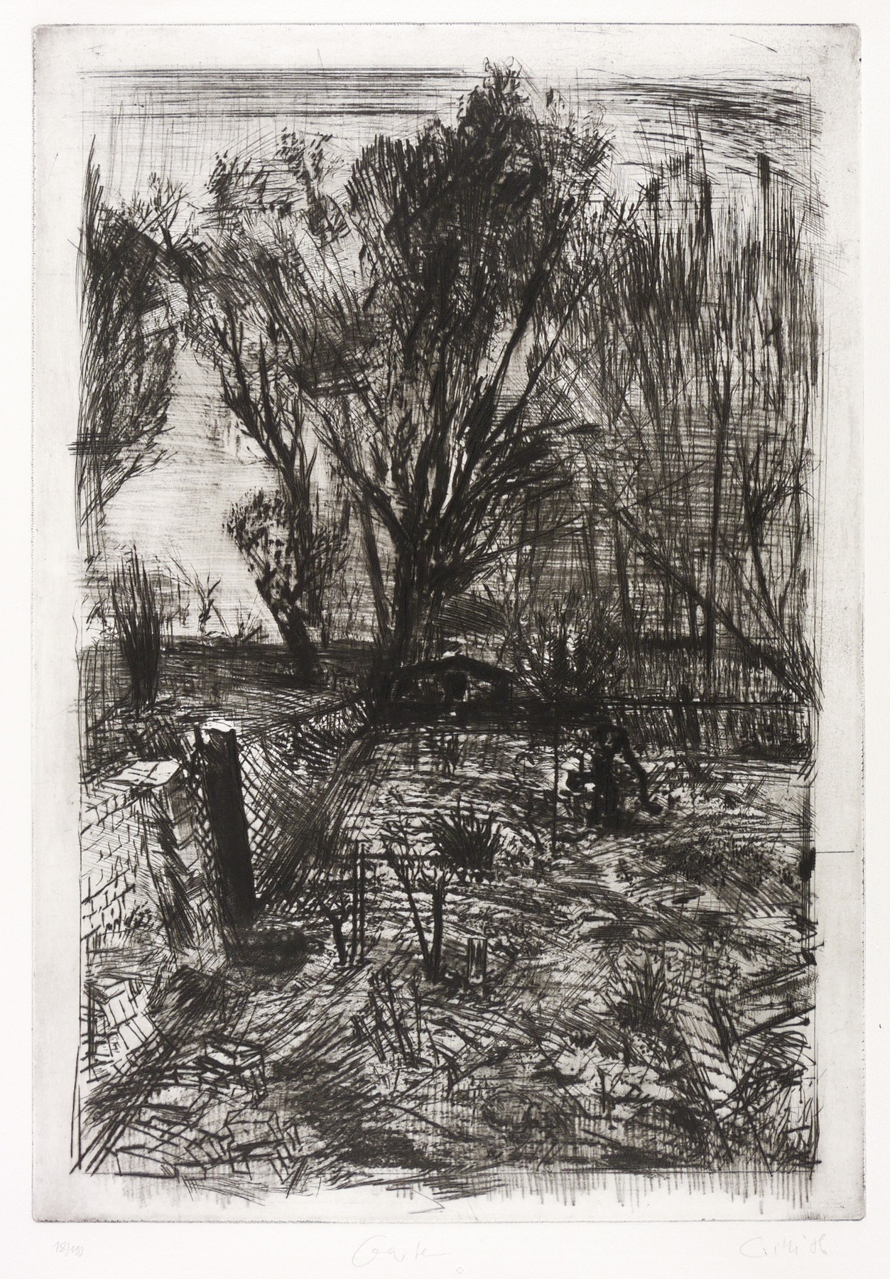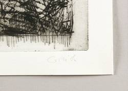 Aus: Sighard Gille, auge ufer hain. Sechs Radierungen, gewidmet Wassili Schukschin (Leipzig: Reclam 1987). – Rechts unten in Bleistift signiert und datiert: ″Gille 86″. Links Auflagenbezeichnung: ″18/110″. Mittig Titel. – Sehr gut erhalten.