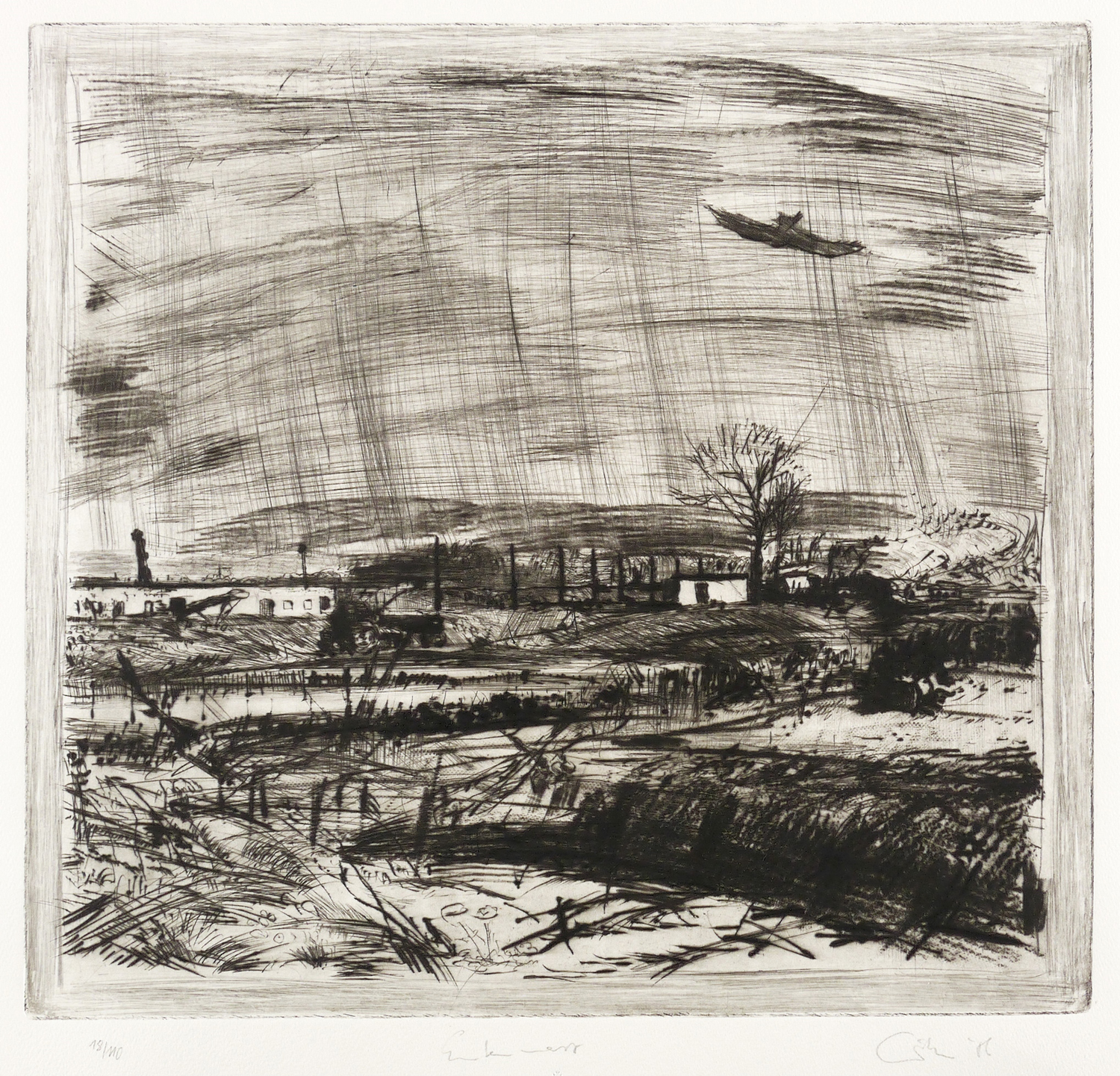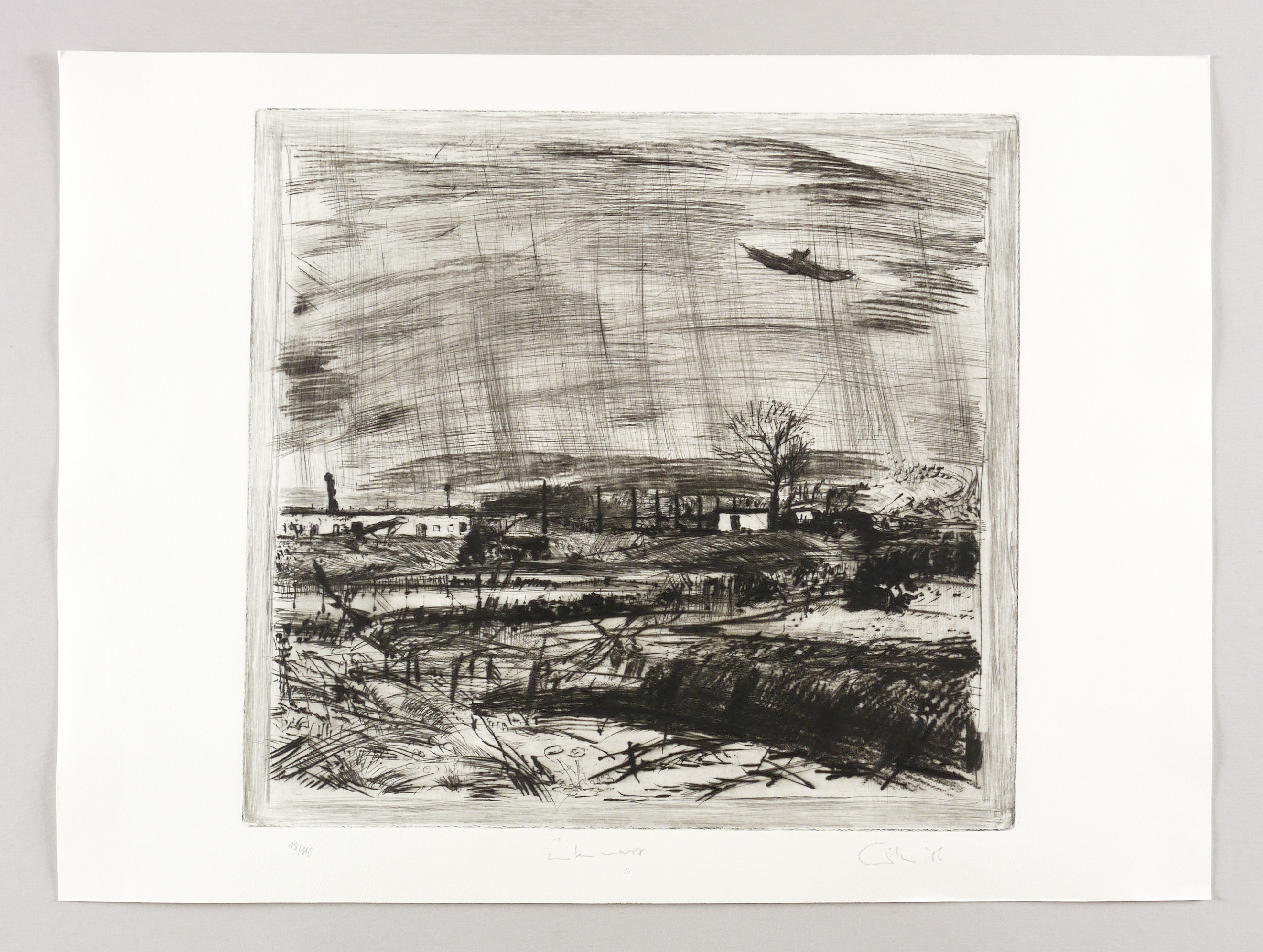Aus: Sighard Gille, auge ufer hain. Sechs Radierungen, gewidmet Wassili Schukschin (Leipzig: Reclam 1987). – Rechts unten in Bleistift signiert und datiert: ″Gille 86″. Links Auflagenbezeichnung. Mittig Titel. – Sehr guter Zustand.