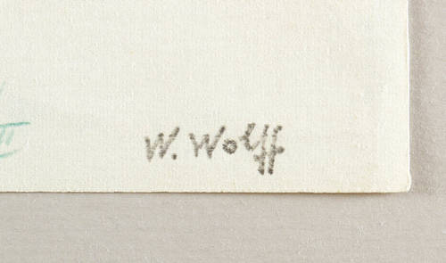 Willy Wolff (1905 Dresden - 1985 Dresden). Deutscher Maler, Bildhauer und Grafiker. 1920-24 Lehre zum Kunsttischler. 1925-27 Weiterbildungskurse von Professor Max Frey. 1927-33 Studium an der Kunstakademie Dresden bei Richard Müller und Georg Lürig, ab 1930 Meisterschüler bei Otto Dix. Mit der Entlassung von Dix durch die Nationalsozialisten, verließ auch Wolfff die Dresdner Akademie. Verlust des größten TEils seiner Arbeiten beim Bombenangriff auf Dresden im Februar 1945. Dieser Moment ist gleichzusetzen mit einem künstlerischen Neuanfang. 1946 gründete er mit anderen Dresdner Künstlern die Künstlergemeinschaft "Das Ufer" und war auch mit ihrer Gründung Mitglied im Verband Bildender Künstler der DDR. In den späten 1950er Jahren übte die Pop-Art großen Einfluß auf ihn aus, von der er eine eigene Vision entwickelte.