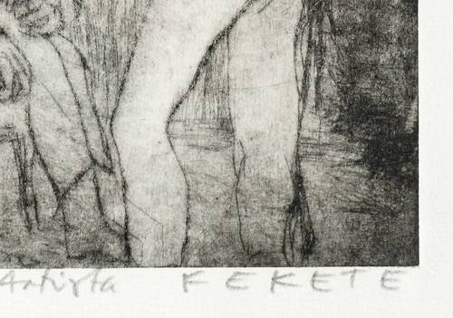 Esteban Fekete (1924 Cinkota / Budapest - 2009 Dieburg). Deutsch-argentinischer Maler, Zeichner und Grafiker. Arbeitete in verschiedenen Techniken wie Öl und Tempera, aber auch in Mischtechniken auf Papier, Holz oder Hartfaser. Anfang der 1970er Jahre entstanden Email-Bilder, Zeichnungen und Linolschnitt. Seine ureigene Technik ist allerdings der Holzschnitt, insbesondere der Farbholzschnitt, mit dem er sich einen Namen machte. So entwickelte er eine eigene Schnitt- und Bearbeitungstechnik für die Holzplatten. Für die Farbgebung verwendete er eigens dafür gesuchte Ölfarben.
