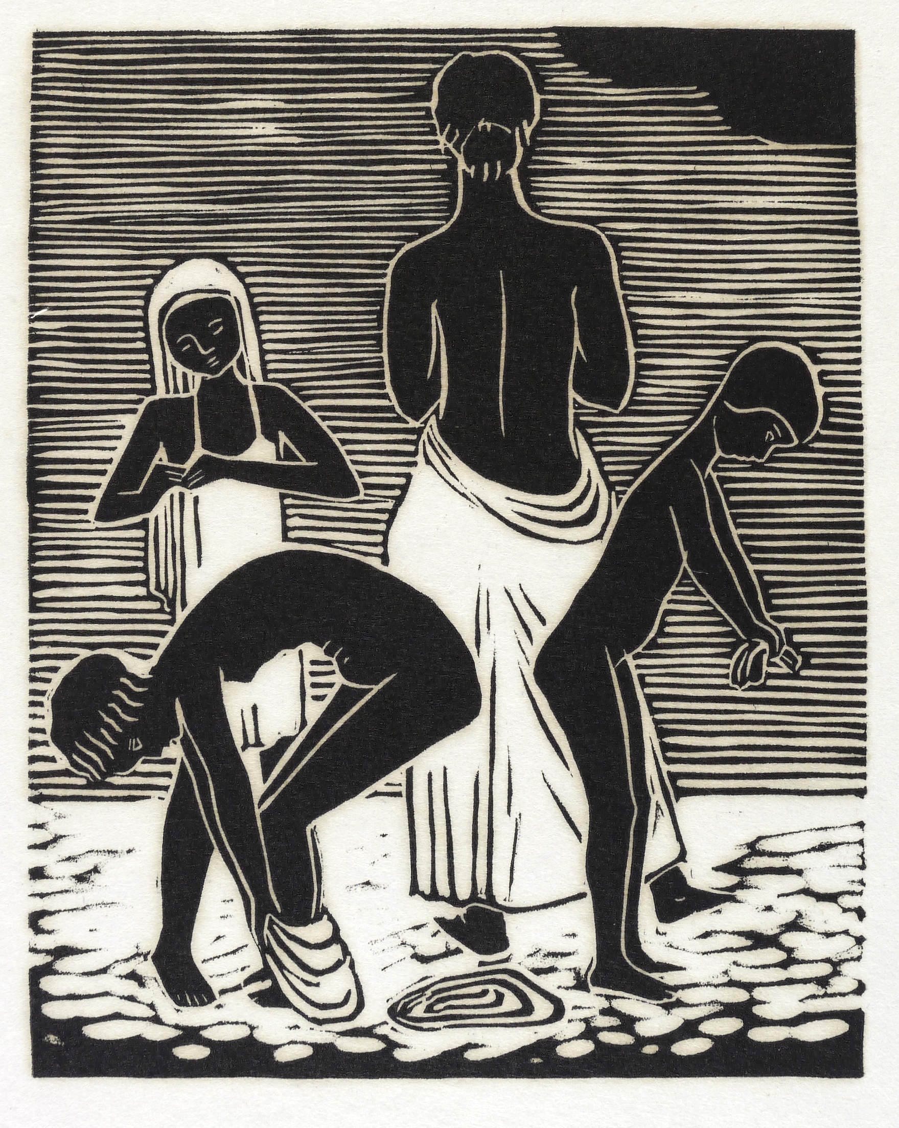 Nicht handsigniert. Am unteren Blattrand in Bleistift ausführlich bezeichnet: ″Badende / Linolschnitt / 1955 / von Peter Szaif″. – Blattecke rechts unten leicht knickspurig. Sonst sehr gut erhalten.