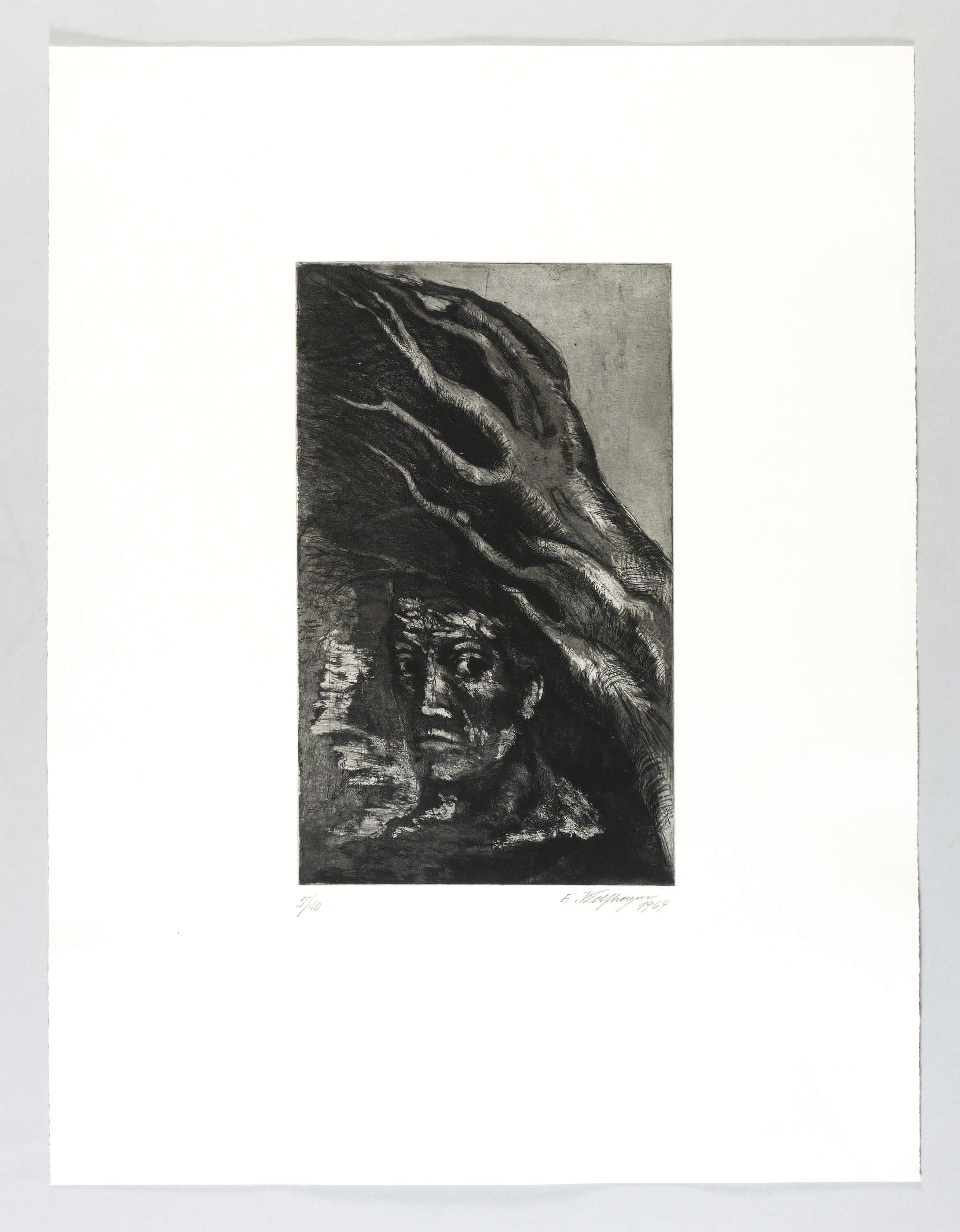 1964. Farbradierung / Aquatinta & Strichätzung, in Grau & Schwarz, auf hellchamois Velinkarton. – Originale Künstlergrafik, von Ernst Wolfhagen. – Auflage Exemplar Nr. 5/10. – 30,8 x 18,5 cm (Darstellung / Platte), 57 x 43 cm (Blatt).