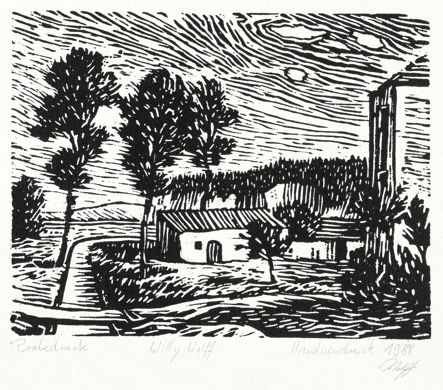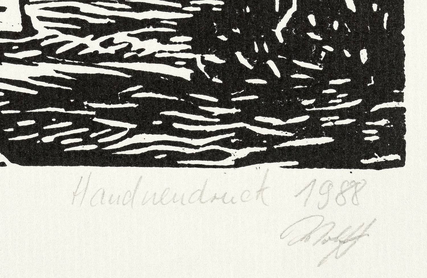 1988. Holzschnitt, in Schwarz, auf hellem Maschinenbütten. – Originale Künstlergrafik, von Willy Wolff. – 15,3 x 19,8 cm (Darstellung / Druckstock), 38 x 46 cm (Blatt).