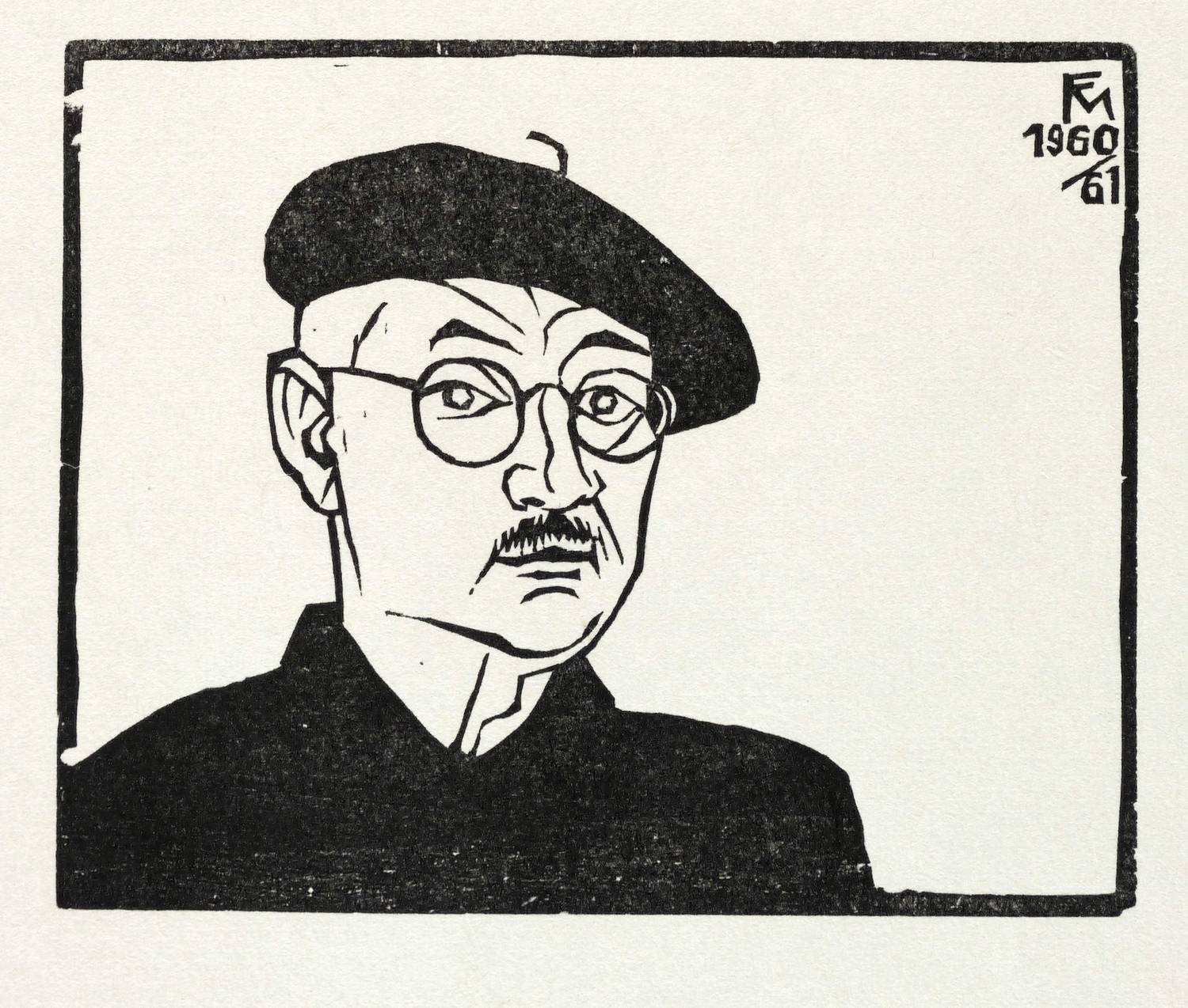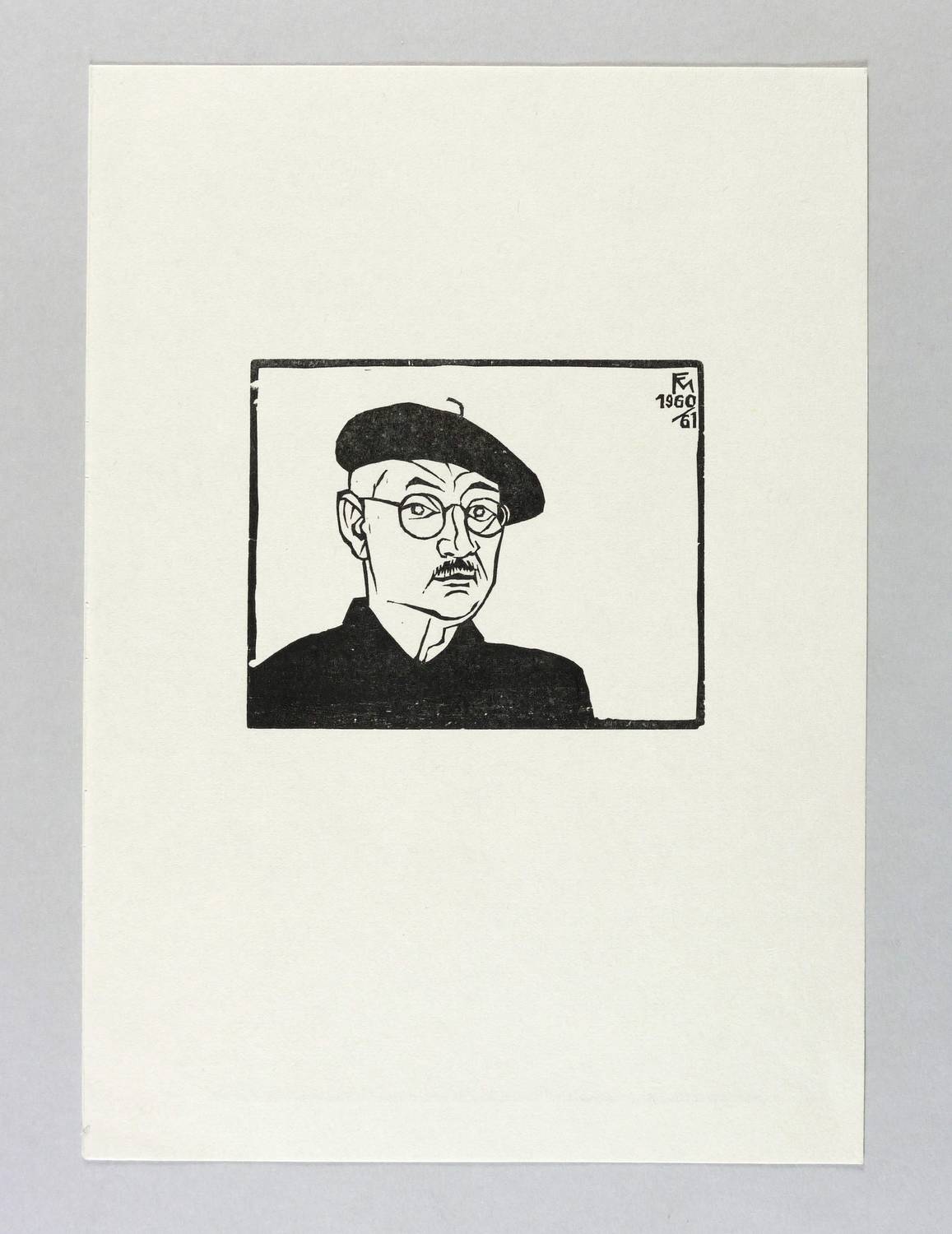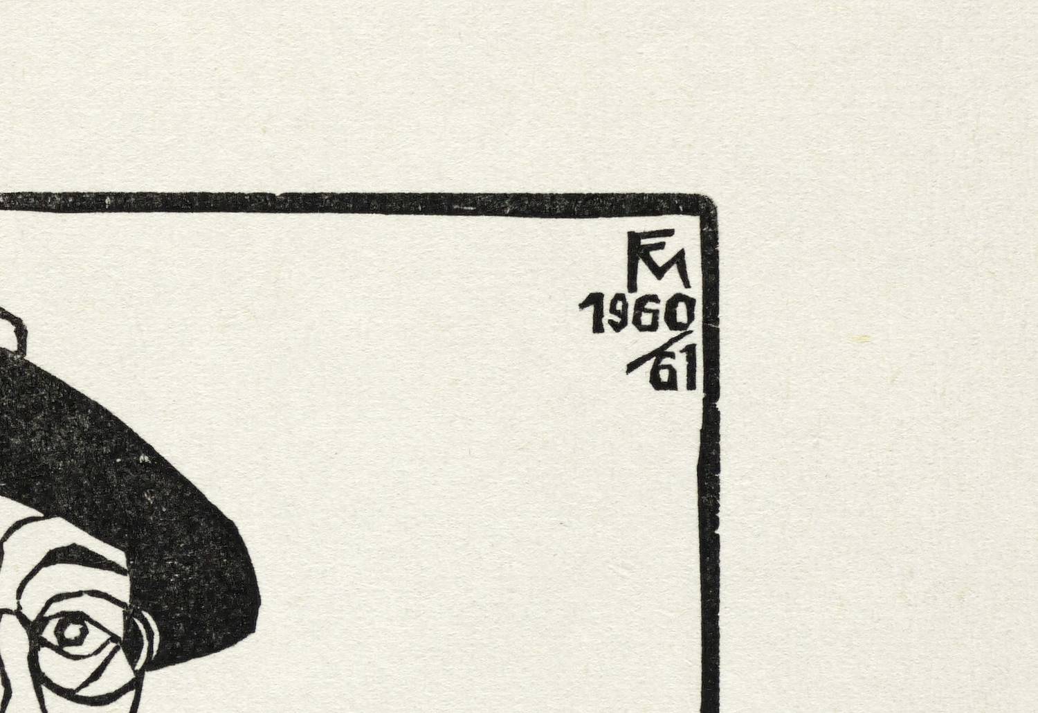 Söhn 588. – Nicht handsigniert. Im Druckstock rechts oben Monogramm und Jahr: ″FM 1960/61″. Verso typografisch bezeichnet: ″CONRAD FELIXMÜLLER, 'Selbstbildnis mit Baskenmütze' Original-Holzschnitt, Werkverzeichnis Söhn 588, 1960/61″. – Abzug vom originalen Druckstock aus Birnbaumholz. – Ohne Tadel. Sehr gut erhalten.