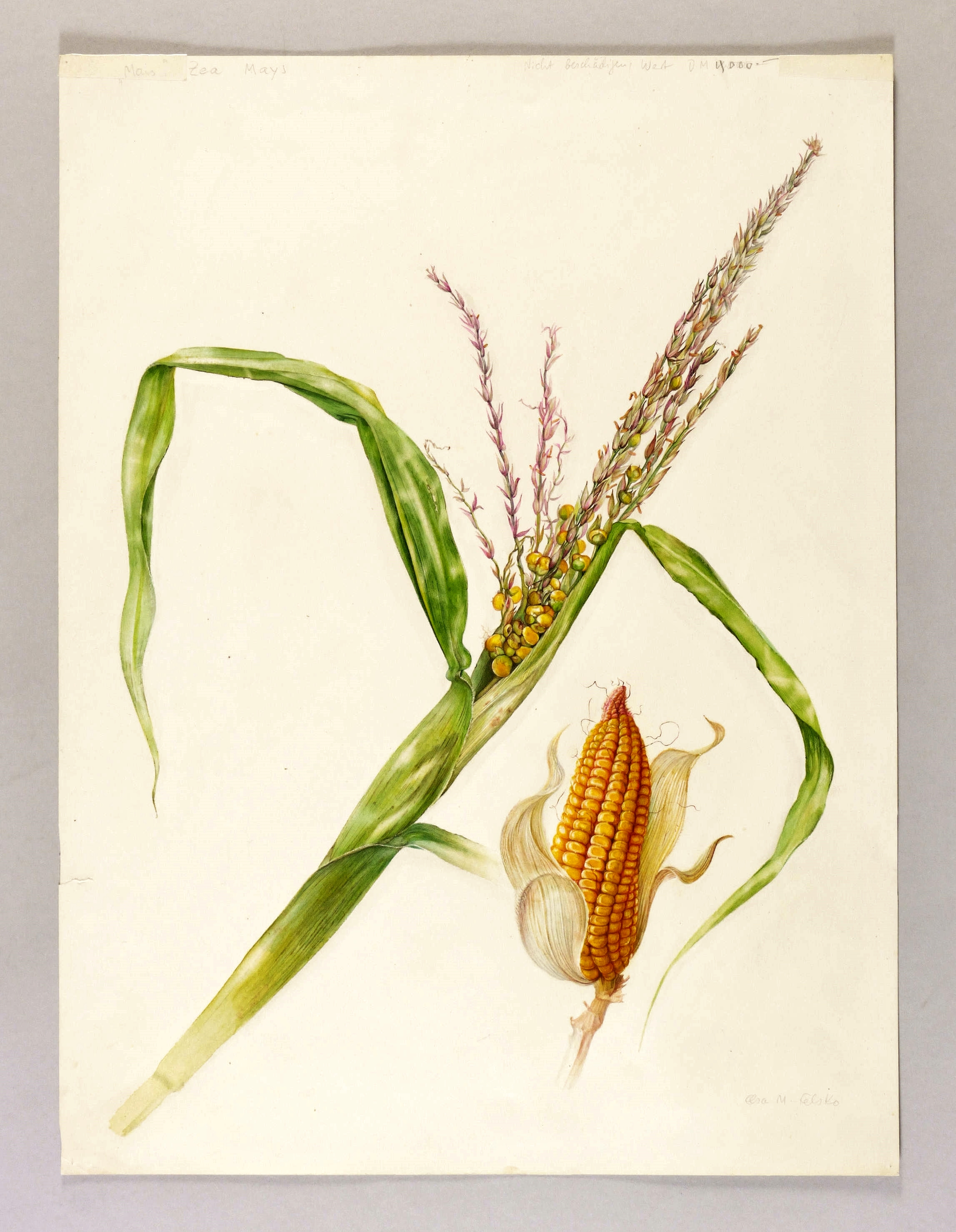 Rechts unten in Bleistift signiert: ″Elsa M. Felsko″. Links oben bezeichnet: ″Mais. Zea Mays // Nicht beschädigen, Wert DM 4.000,-″. Wasserzeichen. – Botanisches Aquarell von allerhöchster zeichnerischer wie koloristischer Qualität. – In den Ecken originale Reißzwecklöchlein. Hinterlegter kurzer Einriss im linken Rand unten (15 mm). Farben kräftig und frisch. Insgesamt mäßig guter bis guter Erhaltungszustand.