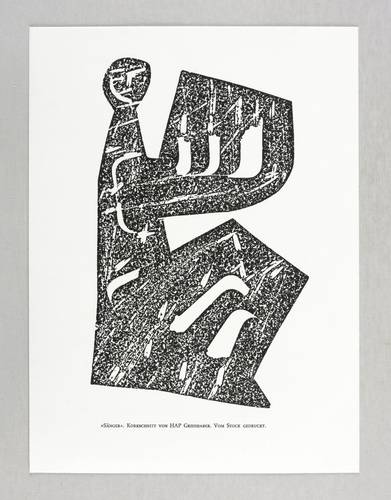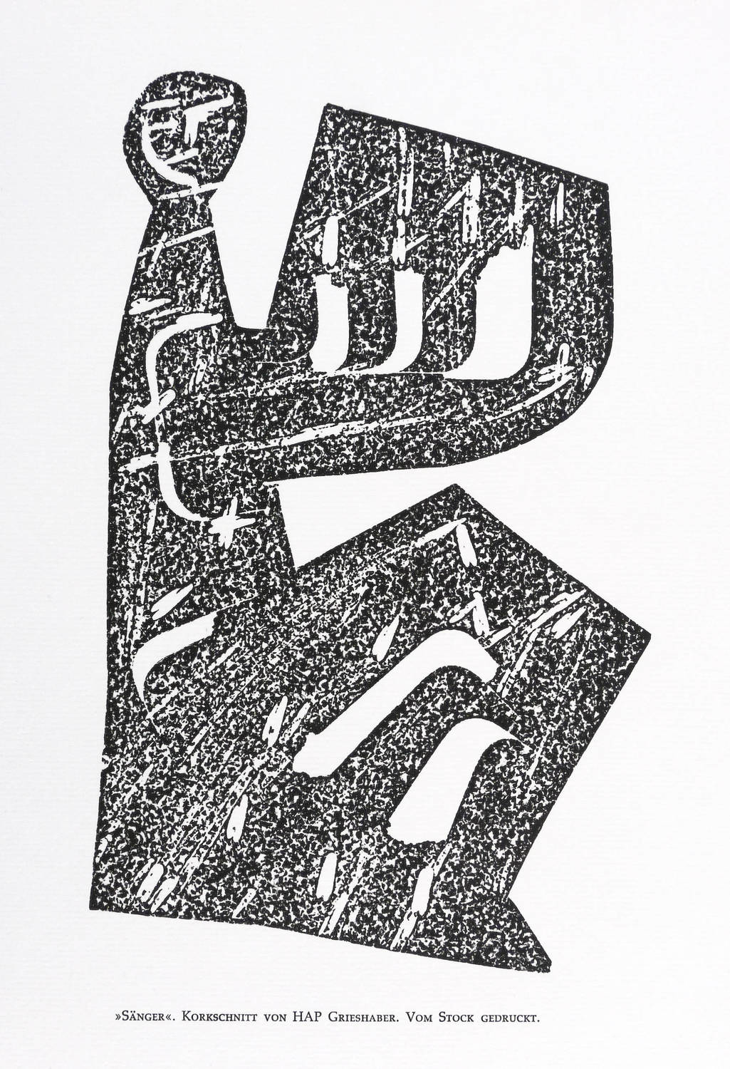Fürst 72/93. – Nicht handsigniert. Unterhalb typografisch bezeichnet: ″'SÄNGER'. KORKSCHNITT VON HAP GRIESHABER. VOM STOCK GEDRUCKT.″ – Originalgrafische Beilage zu ″Attempto. Nachrichten für die Freunde der Universität Tübingen″ Nr. 45/46 (Tübingen 1972). – Sehr guter Zustand.