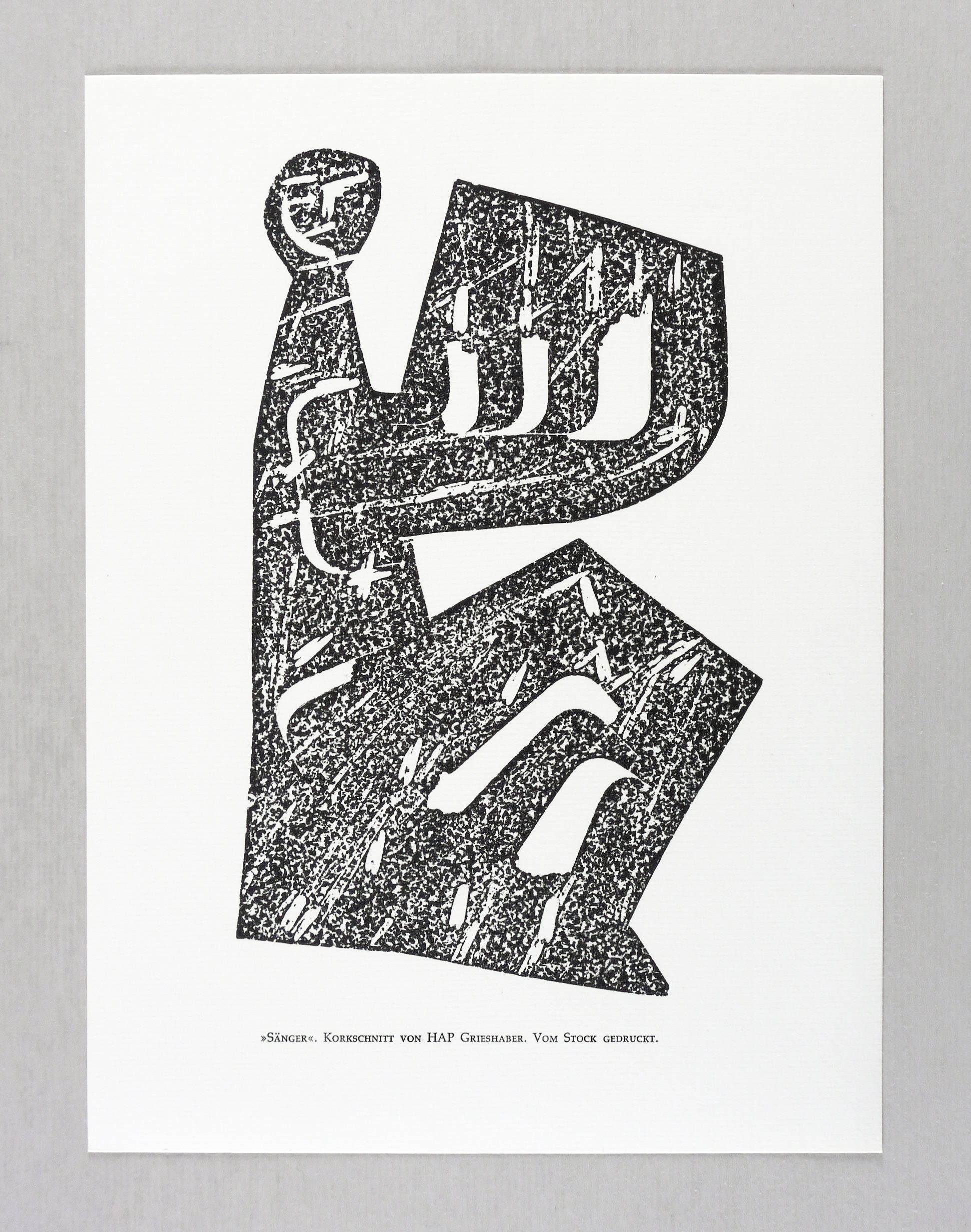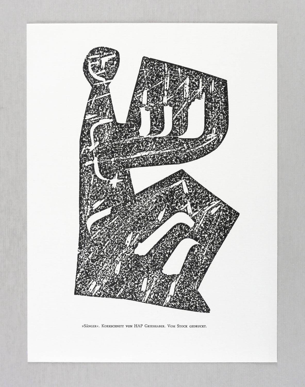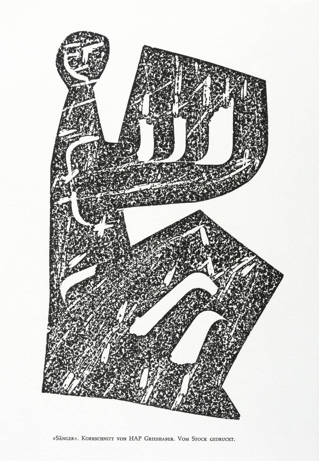 Fürst 72/93. – Nicht handsigniert. Unterhalb typografisch bezeichnet: ″'SÄNGER'. KORKSCHNITT VON HAP GRIESHABER. VOM STOCK GEDRUCKT.″ – Originalgrafische Beilage zu ″Attempto. Nachrichten für die Freunde der Universität Tübingen″ Nr. 45/46 (Tübingen 1972). – Sehr guter Zustand.