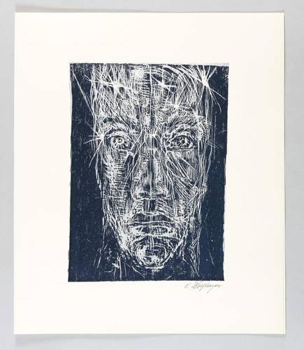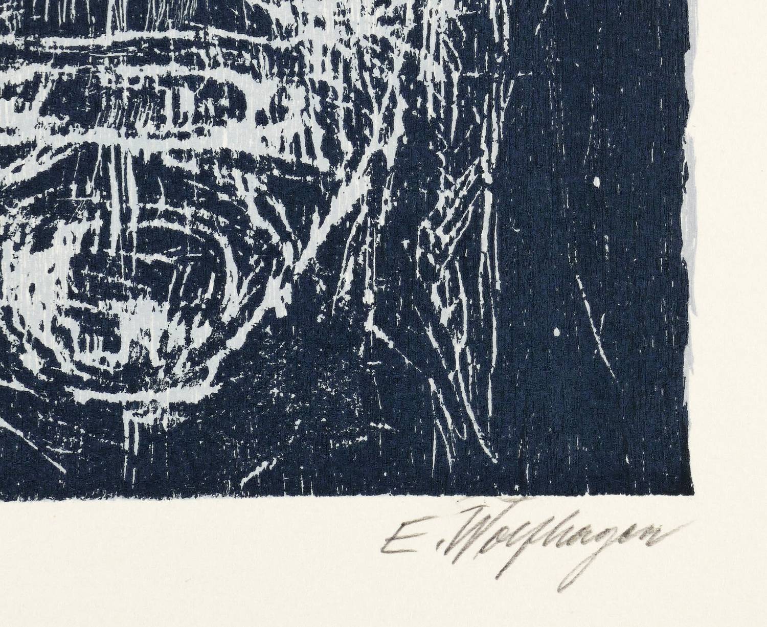 Aus: Flamme, Durst und Schrei. Farbholzschnitte zu expressionistischer Lyrik (Hannover: Werkkunstschule 1968). – Rechts unten in Bleistift signiert: ″E. Wolfhagen″. Auf der Doppelseite typografischer Text: ″Kurt Heynicke / Mensch // Ich bin über den Wäldern, / grün und leuchtend, / hoch über allen, / ich, der Mensch. / (...)″. – Zu einem Gedicht des expressionistischen Lyrikers Kurt Heynicke. – Tadellos. Vollständig mit dem Textblatt. Sehr guter Zustand.