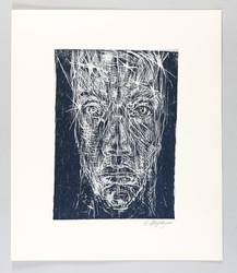 1968. Farbholzschnitt, in Hellgrau & Blauschwarz, auf hellgelbem Velinkarton. – Originale Künstlergrafik, von Ernst Wolfhagen. – 25,7 x 18,5 cm (Darstellung / Druckstock), 38 x 32 cm (Blätter).