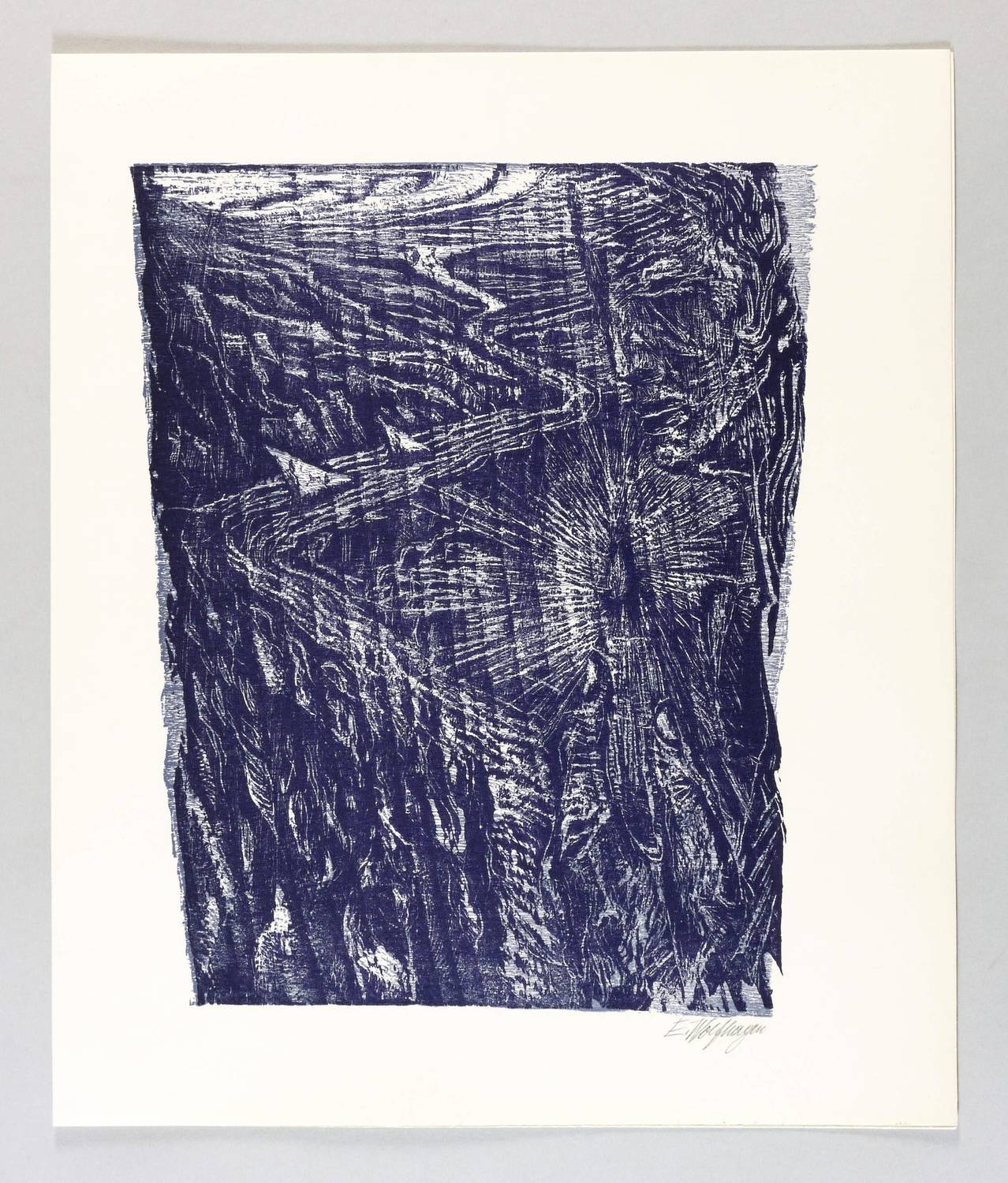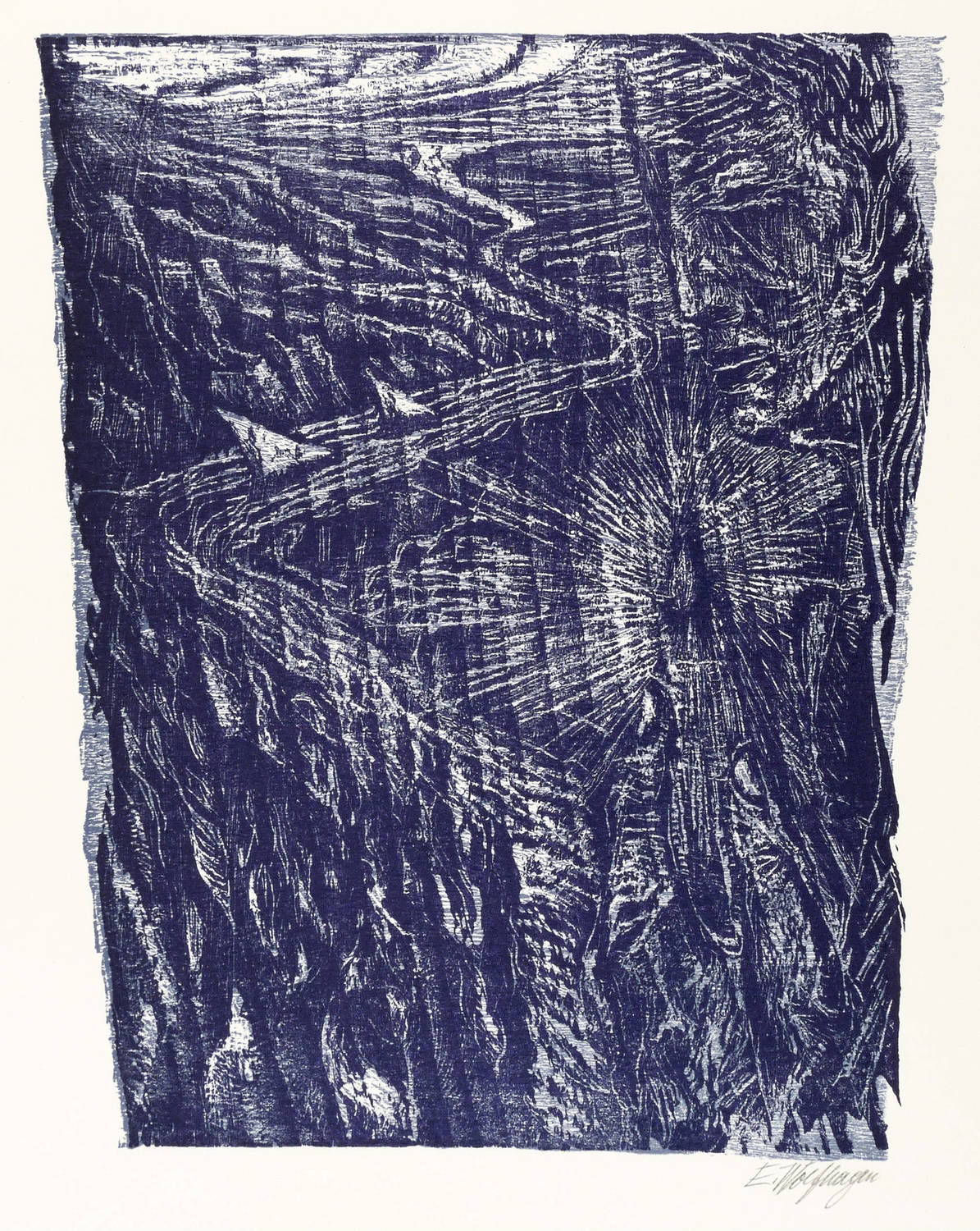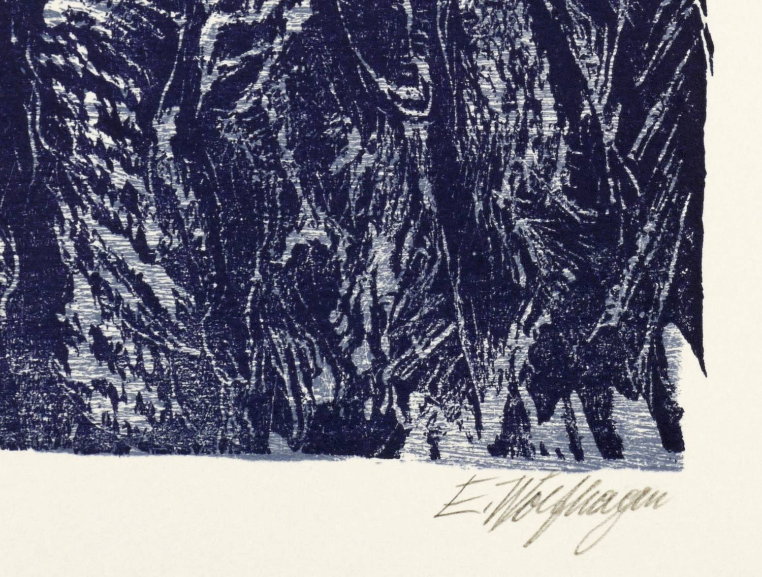Aus: Flamme, Durst und Schrei. Farbholzschnitte zu expressionistischer Lyrik (Hannover: Werkkunstschule 1968). – Rechts unten in Bleistift signiert: ″E. Wolfhagen″. Auf der Doppelseite typografischer Text: ″Georg Heym / Alle Landschaft haben... // Alle Landschaften haben / Sich mit Blau erfüllt. / Alle Büsche und Bäume des Stromes, / Der weit in den Norden schwillt. / (...) / Cymbeln lassen sie klingen / In den Händen licht. / Manche flüstern und halten / Kerzen vor ihr Gesicht.″ – Zu einem Gedicht des expressionistischen Lyrikers Georg Heym (1887-1912). – Tadellos. Vollständig mit dem Textblatt. Sehr guter Zustand.