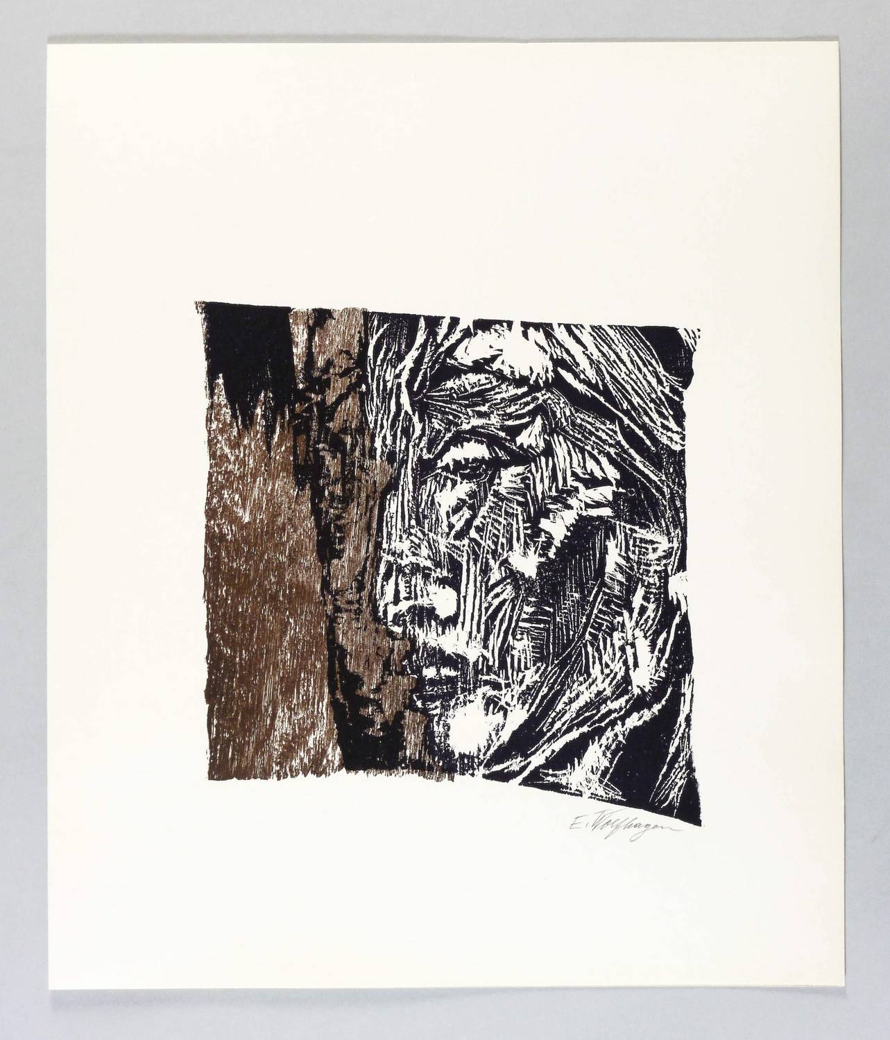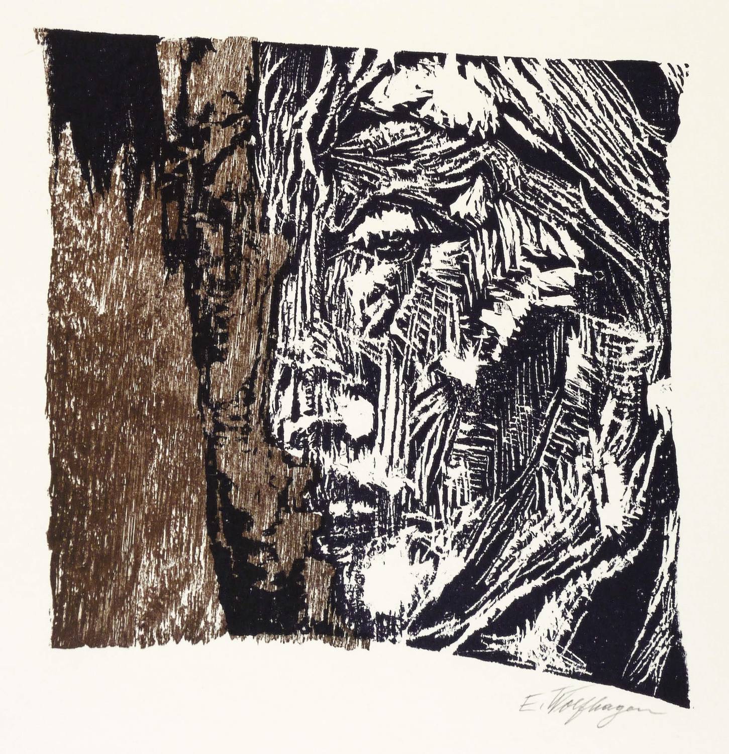 1968. Farbholzschnitt, in Braun & Schwarz, auf hellgelbem Velinkarton. – Originale Künstlergrafik, von Ernst Wolfhagen. – 21,3 x 20,3 cm (Darstellung / Druckstock), 38 x 32 cm (Blätter).