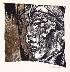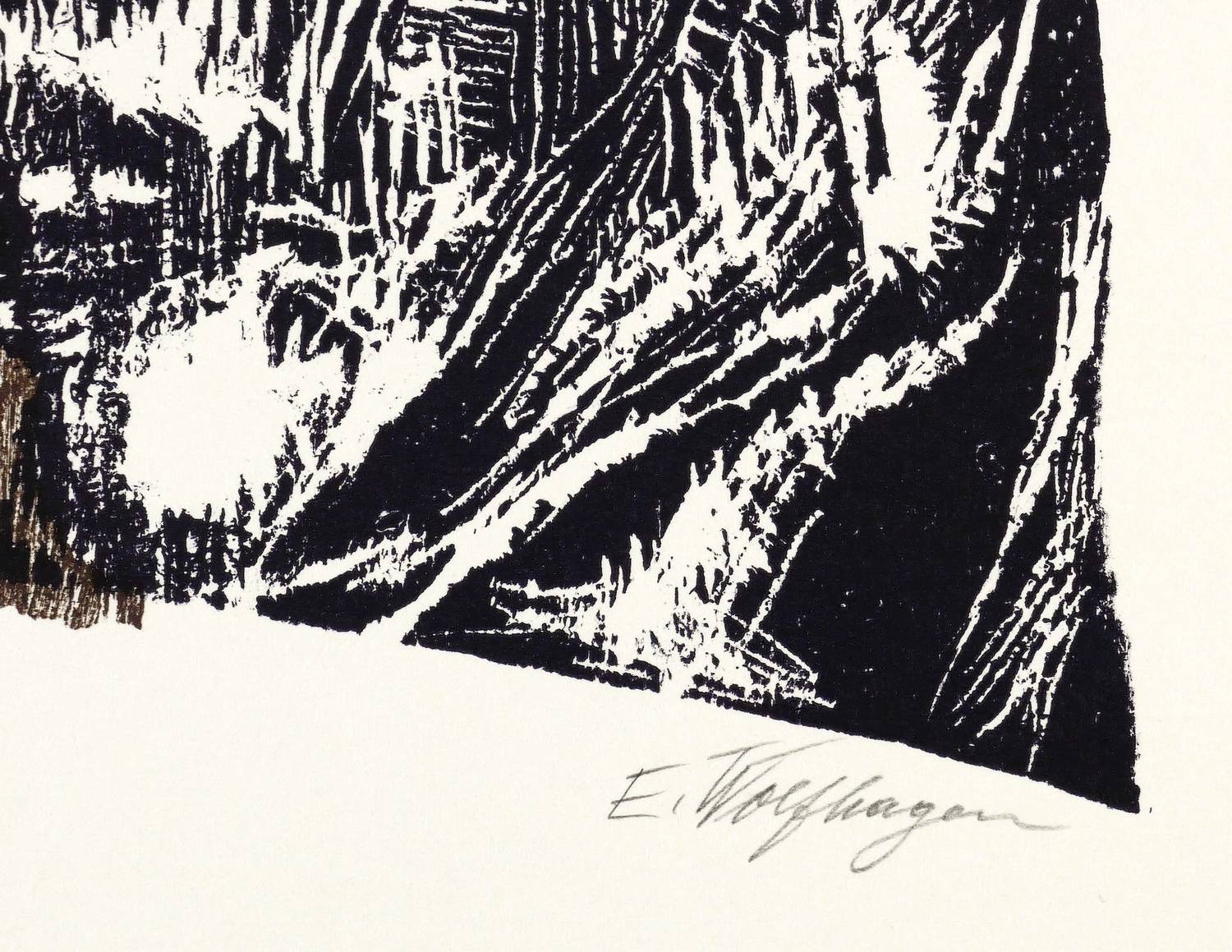 Aus: Flamme, Durst und Schrei. Farbholzschnitte zu expressionistischer Lyrik (Hannover: Werkkunstschule 1968). – Rechts unten in Bleistift signiert: ″E. Wolfhagen″. Auf der Doppelseite typografischer Text: ″Jakob van Hoddis / Tristitia ante... // Schneeflocken fallen. Meine Nächte sind / Sehr laut geworden, und zu starr ihr Leuchten. / Alle Gefahren, die mir ruhmvoll deuchten, / Sind un so widrig wie der Winterwind. / (...)″. – Zu einem Gedicht des expressionistischen Schriftstellers Jakob van Hoddis (1887-1942). – Tadellos. Vollständig mit dem Textblatt. Sehr guter Zustand.