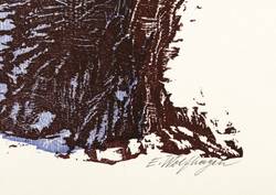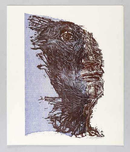 Aus: Flamme, Durst und Schrei. Farbholzschnitte zu expressionistischer Lyrik (Hannover: Werkkunstschule 1968). – Rechts unten in Bleistift signiert: ″E. Wolfhagen″. Auf der Doppelseite typografischer Text: ″Franz Werfel / Wir nicht // Ich lauschte in die Krone des Baums; - da hieß es im Laub: / Noch - nicht! / Ich legte das Ohr an die Erde; - da klopft's unter Kraut und Staub: / Noch - nicht! / Ich sah mich im Spiegel; mein Spiegelbild grinste: / Du - nicht! / (...).″ – Zu einem Gedicht des expressionistischen Schriftstellers Franz Werfel (1890-1945). – Tadellos. Vollständig mit dem Textblatt. Sehr guter Zustand.