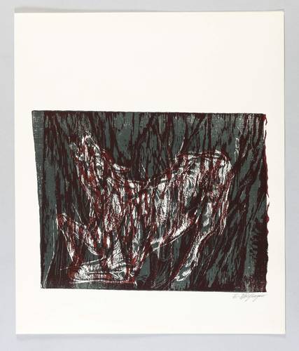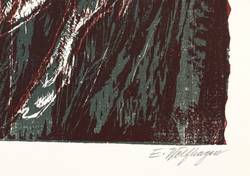 1968. Farbholzschnitt, in Anthrazit & Rotbraun, auf hellgelbem Velinkarton. – Originale Künstlergrafik, von Ernst Wolfhagen. – 21,2 x 28,1 cm (Darstellung / Druckstock), 38 x 32 cm (Blätter).