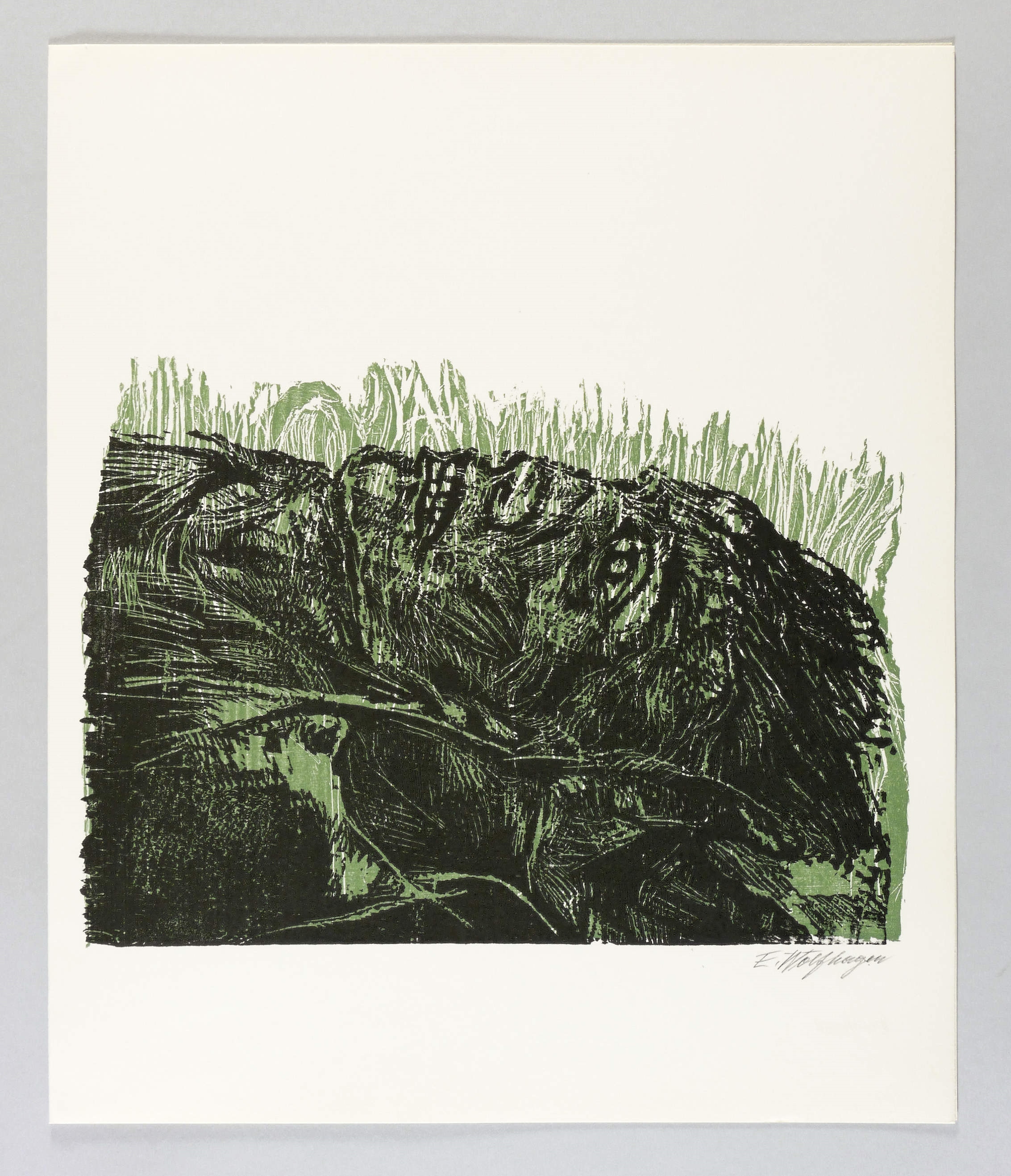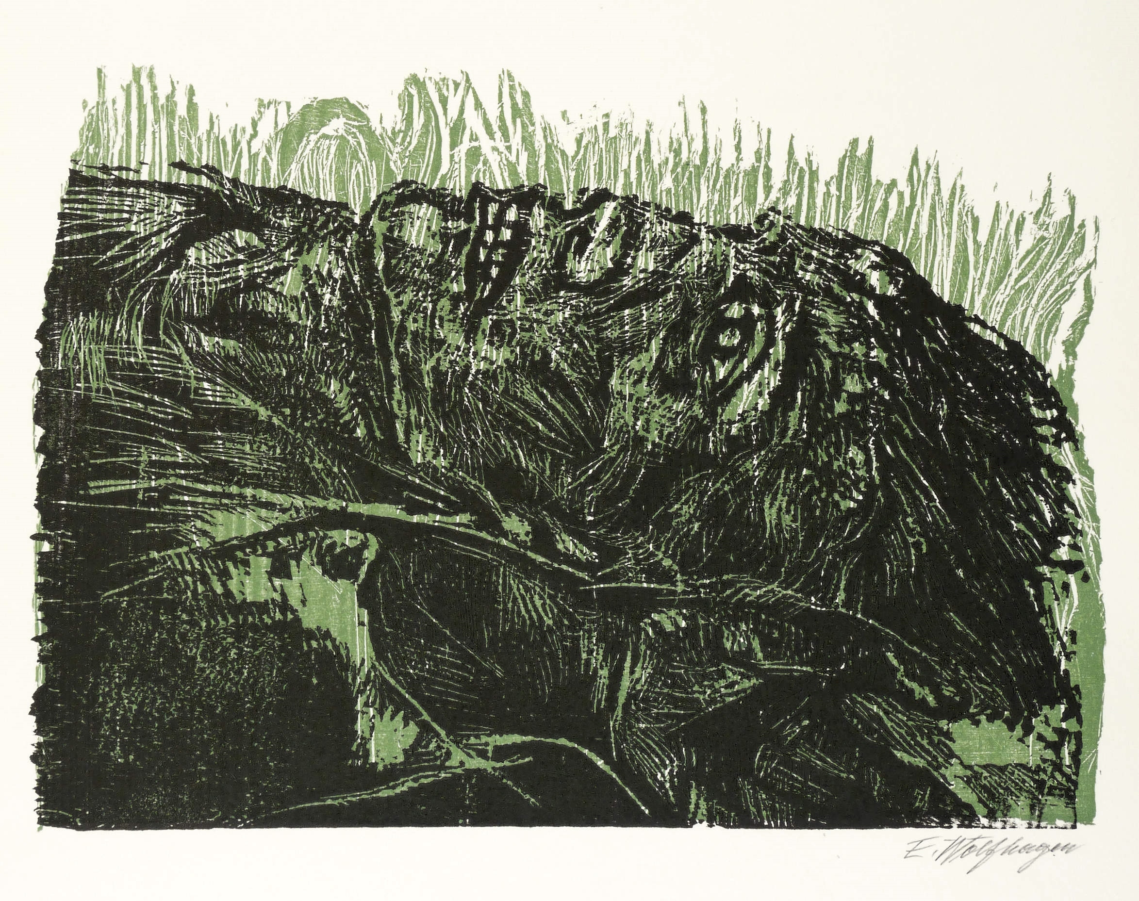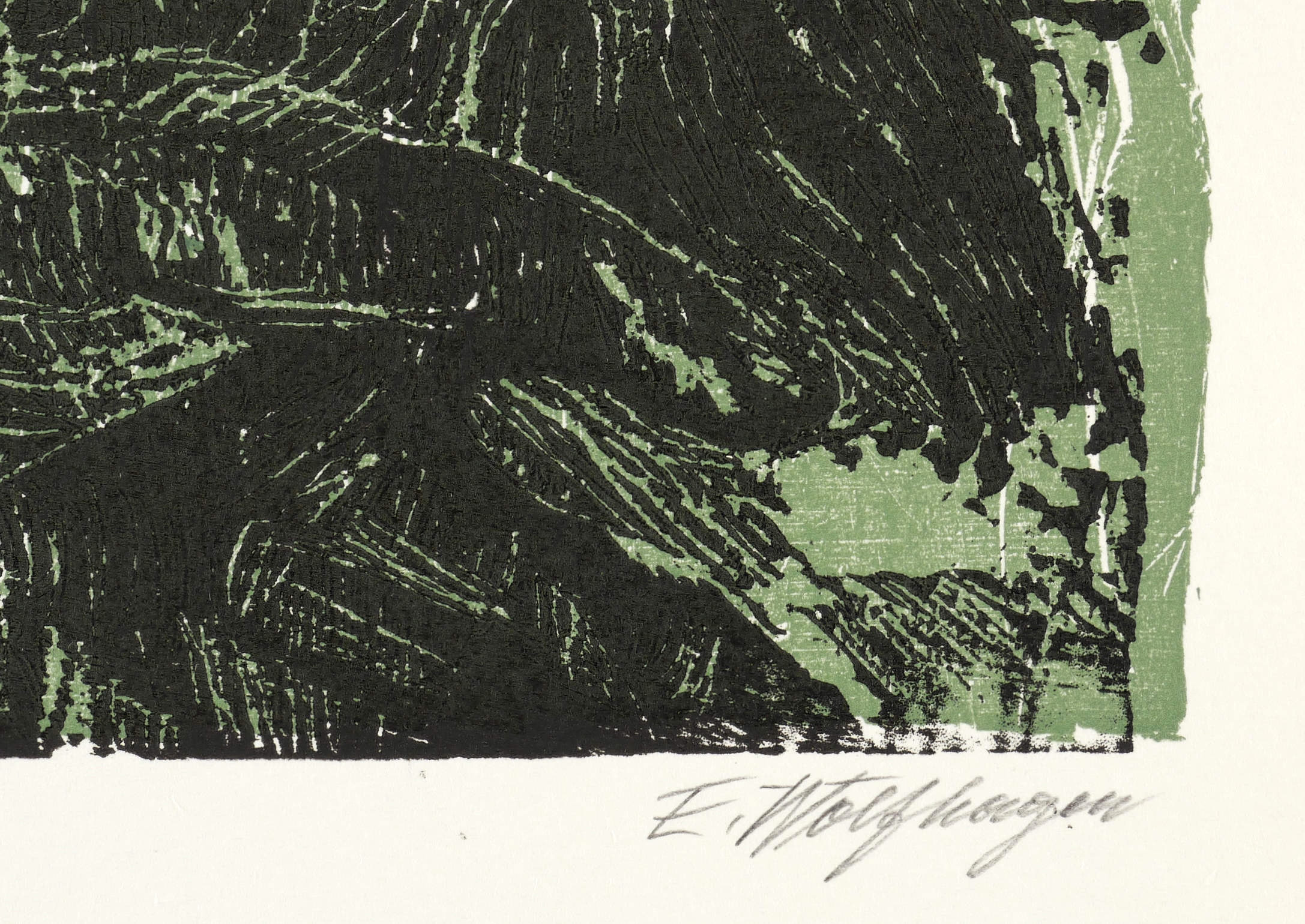 1968. Farbholzschnitt, in Grün & Schwarz, auf hellgelbem Velinkarton. – Originale Künstlergrafik, von Ernst Wolfhagen. – 20,7 x 29,0 cm (Darstellung / Druckstock), 38 x 32 cm (Blätter).