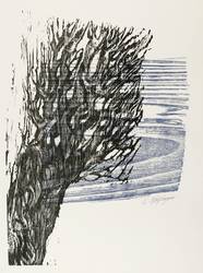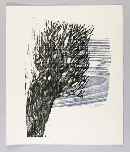 Aus: Flamme, Durst und Schrei. Farbholzschnitte zu expressionistischer Lyrik (Hannover: Werkkunstschule 1968). – Rechts unten in Bleistift signiert: ″E. Wolfhagen″. Auf der Doppelseite typografischer Text: ″Theodor Däubler / Die Buche // Die Buche sagt: Mein Walten bleibt das Laub. / Ich bin kein Baum mit sprechenden Gedanken, / Mein Ausdruck wird ein Ästeüberranken, / Ich bin das Laub, die Krone überm Staub. // (...)″. – Zu einem Gedicht des expressionistischen Lyrikers Theodor Däubler (1876-1934). – Tadellos. Vollständig mit dem Textblatt. Sehr guter Zustand.