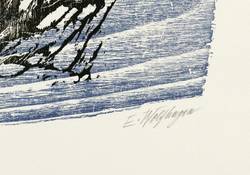 1968. Farbholzschnitt, in Blaugrau & Schwarz, auf hellgelbem Velinkarton. – Originale Künstlergrafik, von Ernst Wolfhagen. – 32,9 x 23,7 cm (Darstellung / Druckstock), 38 x 32 cm (Blätter).