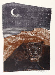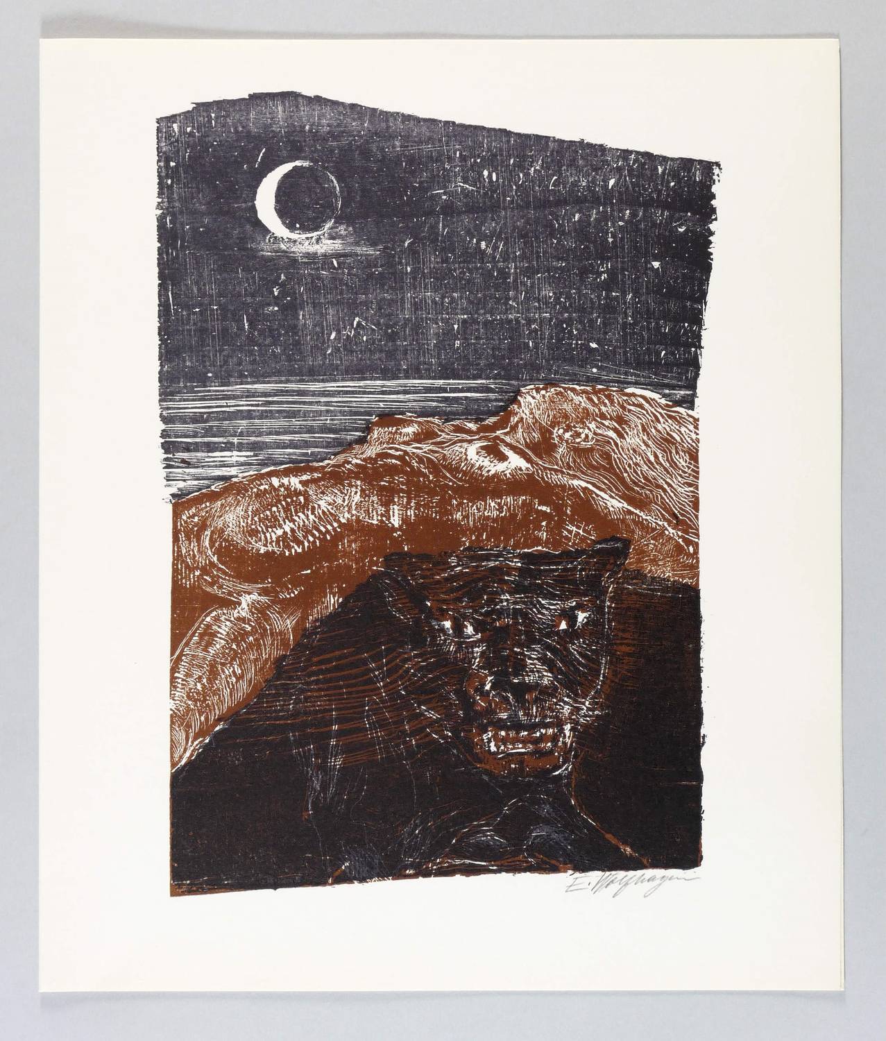 1968. Farbholzschnitt, in Anthrazit, Braun & Schwarz, auf hellgelbem Velinkarton. – Originale Künstlergrafik, von Ernst Wolfhagen. – 32,0 x 22,5 cm (Darstellung / Druckstock), 38 x 32 cm (Blätter).