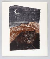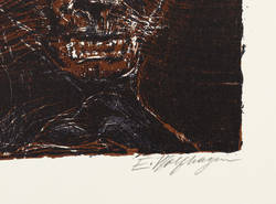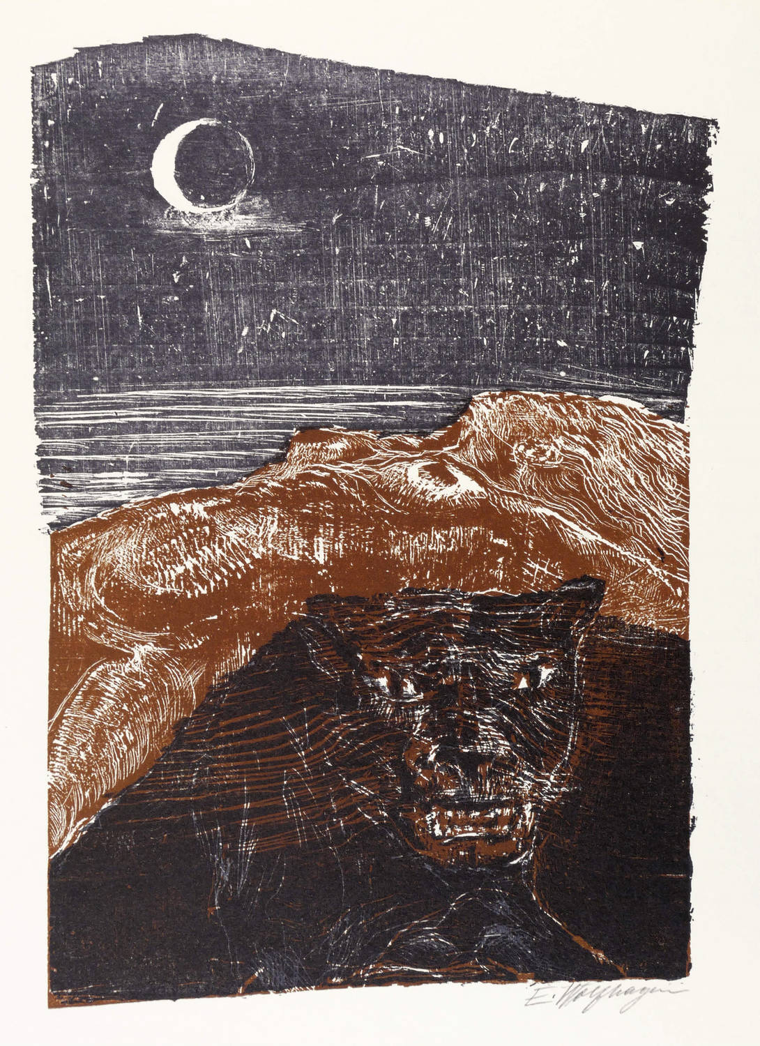 Aus: Flamme, Durst und Schrei. Farbholzschnitte zu expressionistischer Lyrik (Hannover: Werkkunstschule 1968). – Rechts unten in Bleistift signiert: ″E. Wolfhagen″. Auf der Doppelseite typografischer Text: ″Ernst Wilhelm Lotz / WIr fanden Glanz // Wir fanden Glanz, fanden ein Meer, Werkstatt und uns. / Zur Nacht, eine Sichel sang vor unserm Fenster. / Auf unsern Stimmen fuhren wir hinauf, / Wir reisten Hand in Hand. / An deinen Haaren, helles Fest im Morgen, / Irr flogen Küsse hoch / Und stachen reifen Wahnsinn in mein Blut. / (...)″. – Zu einem Gedicht des expressionistischen Lyrikers Ernst Wilhelm Lotz (90-1914). – Tadellos. Vollständig mit dem Textblatt. Sehr guter Zustand.