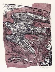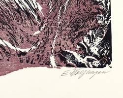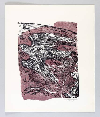 Aus: Flamme, Durst und Schrei. Farbholzschnitte zu expressionistischer Lyrik (Hannover: Werkkunstschule 1968). – Rechts unten in Bleistift signiert: ″E. Wolfhagen″. Auf der Doppelseite typografischer Text: ″Else Lasker-Schüler / Ein Lied // Hinter meinen Augen stehen Wasser, / Die muss ich alle weinen. // Immer möcht ich auffliegen, / Mit den Zugvögeln fort; // Buntatmen mit den Winden / In der großen Luft. // (...)″. – Zu einem Gedicht der expressionistischen Lyrikerin Else Lasker-Schüler (1869-1945) – Tadellos. Vollständig mit dem Textblatt. Sehr guter Zustand.